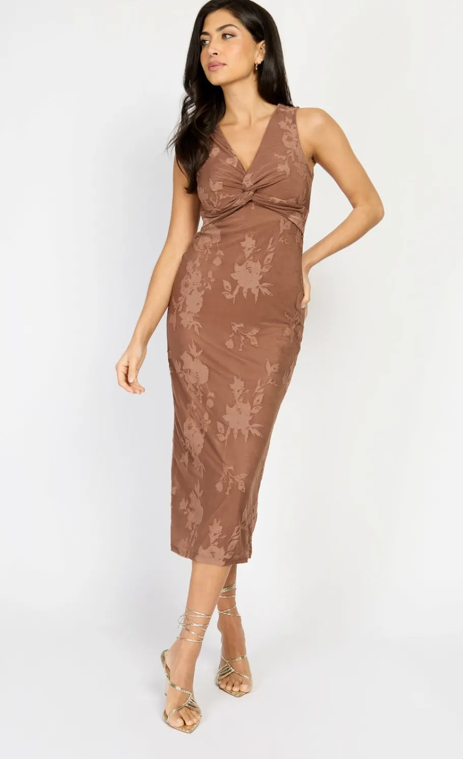 The Chocolate Floral Burnout Mini Dress by Chloe Lewis exudes elegance with its delicate floral pattern and rich chocolate hue. Designed with a flattering V-neck and sleeveless cut, this dress offers a regular fit and A-line silhouette, making it perfect for a variety of occasions. Its midaxi length adds a touch of sophistication, ideal for transitioning from day to night.