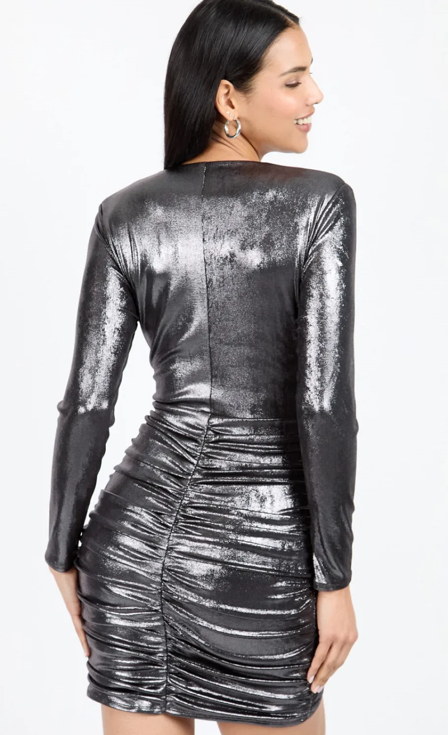 This striking dress features a reflective foil finish and a draped design that creates a fluid, flattering silhouette. The mini length adds a modern edge, perfect for making a bold statement at any event. Embrace a touch of glamour and sophistication with this standout piece. Simply add party shoes!