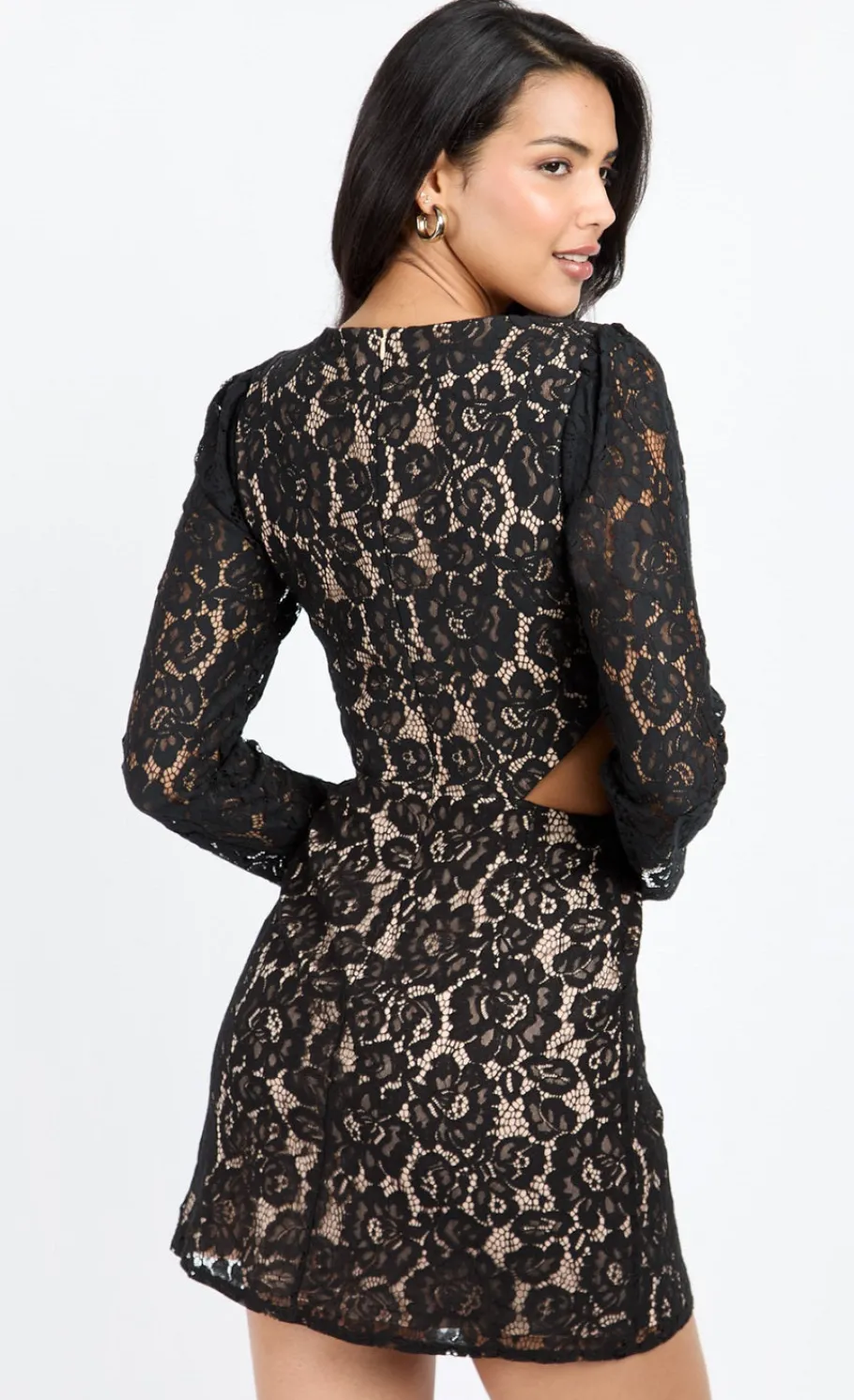 Step out in style with our lace cut-out mini dress. This eye-catching design features delicate lace accents and bold cut-outs, creating a modern yet elegant look. The fitted silhouette highlights your shape, while the mini length adds a playful touch.