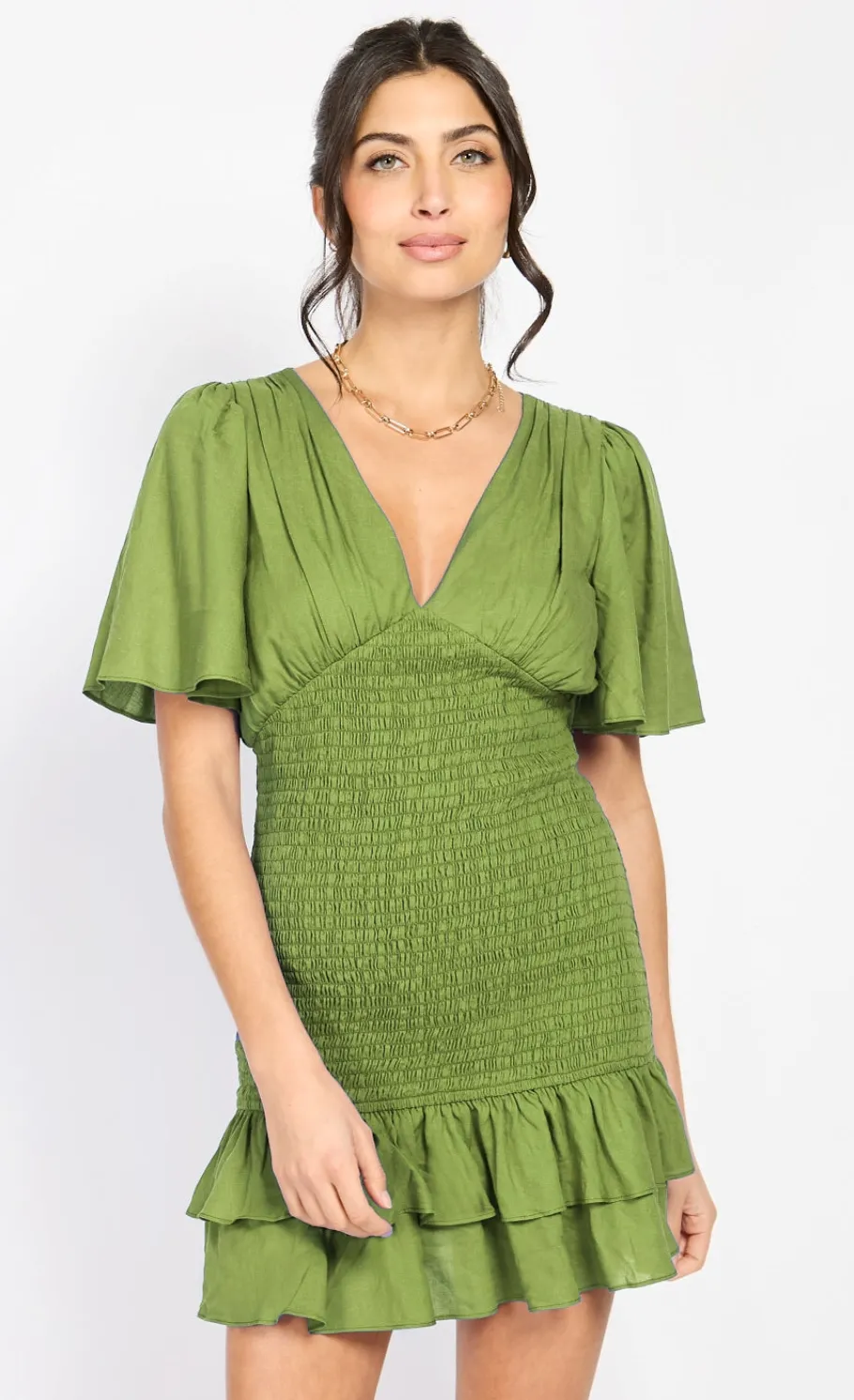 The Olive Frill Mini Dress by Chloe Lewis is a stylish and versatile piece that blends elegance with playfulness. Featuring a flattering V-neck and short sleeves, this dress is designed with a regular fit and an A-line silhouette that gracefully falls to a mini length. The frill details add a feminine touch, making it a perfect choice for both day and night occasions. Crafted from a comfortable fabric, this dress offers a chic look with effortless ease.