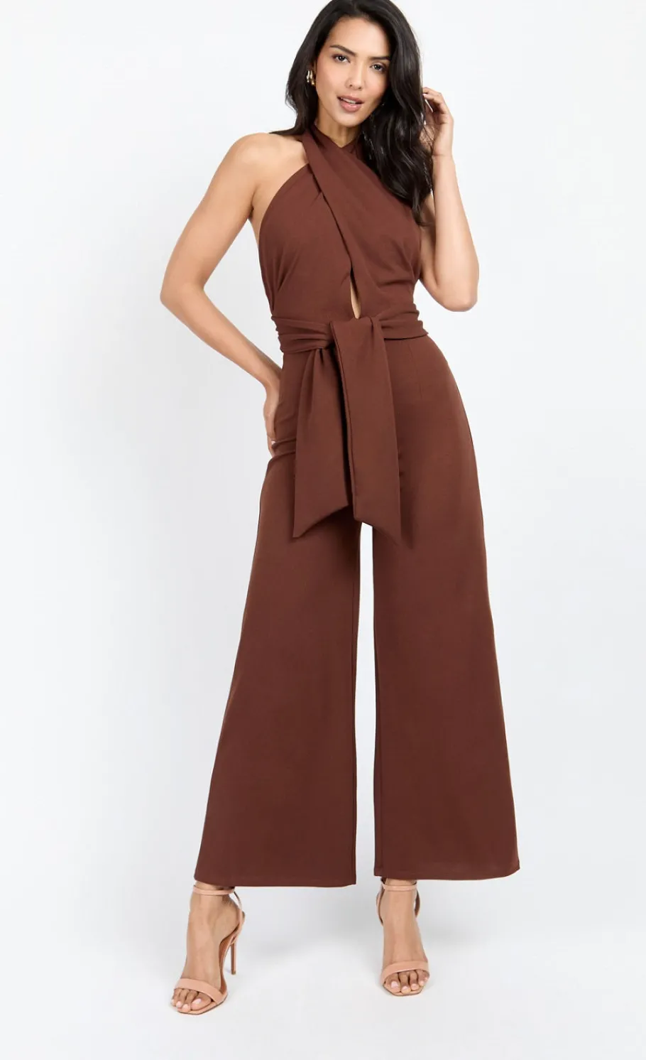 Elevate your style with our chocolate bow back halterneck jumpsuit. This chic piece features a sophisticated halterneck design and a stunning bow detail at the back. The sleek, tailored fit creates a flattering silhouette, perfect for any occasion. Ideal for parties, dinners, or special events, this jumpsuit is a timeless addition to your wardrobe.