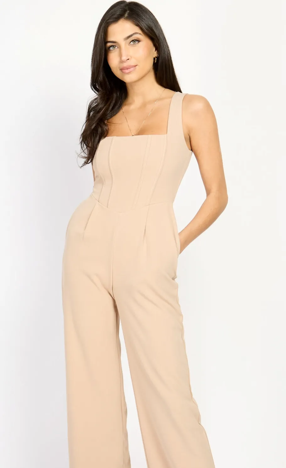 The Taupe Wide Leg Corset Jumpsuit by Chloe Lewis combines chic structure with relaxed elegance. Featuring a square neckline and sleeveless design, this jumpsuit is crafted to flatter with its corset-style fit, defining the waist beautifully. The wide-leg silhouette adds movement and comfort, making it a versatile choice for various occasions.