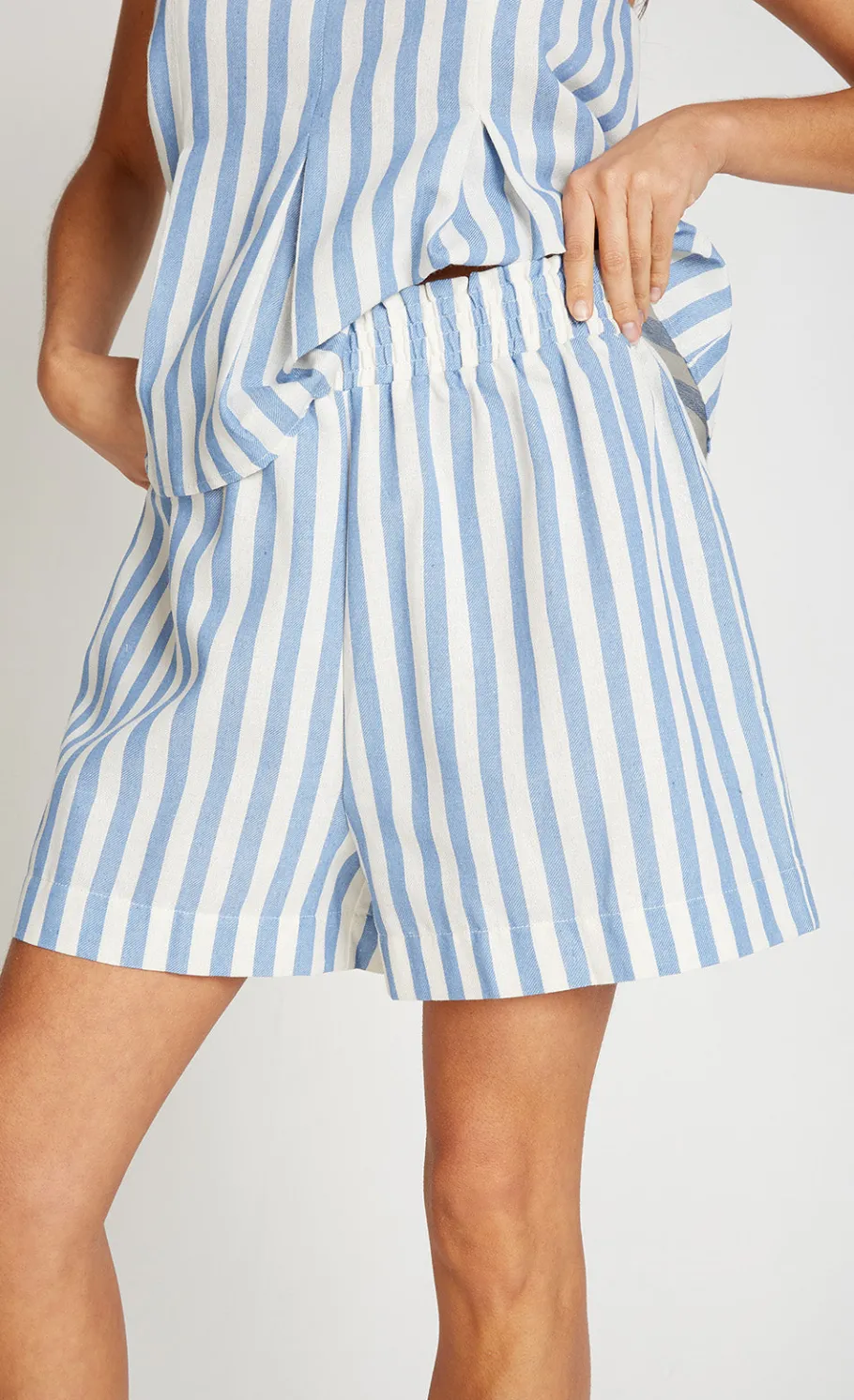 The Blue Stripe Shorts combine comfort and style with a regular waist and fit, offering a relaxed wide-leg silhouette. Perfect for warmer days, these shorts feature a short length and pair effortlessly with other co-ord pieces for a chic, laid-back look.