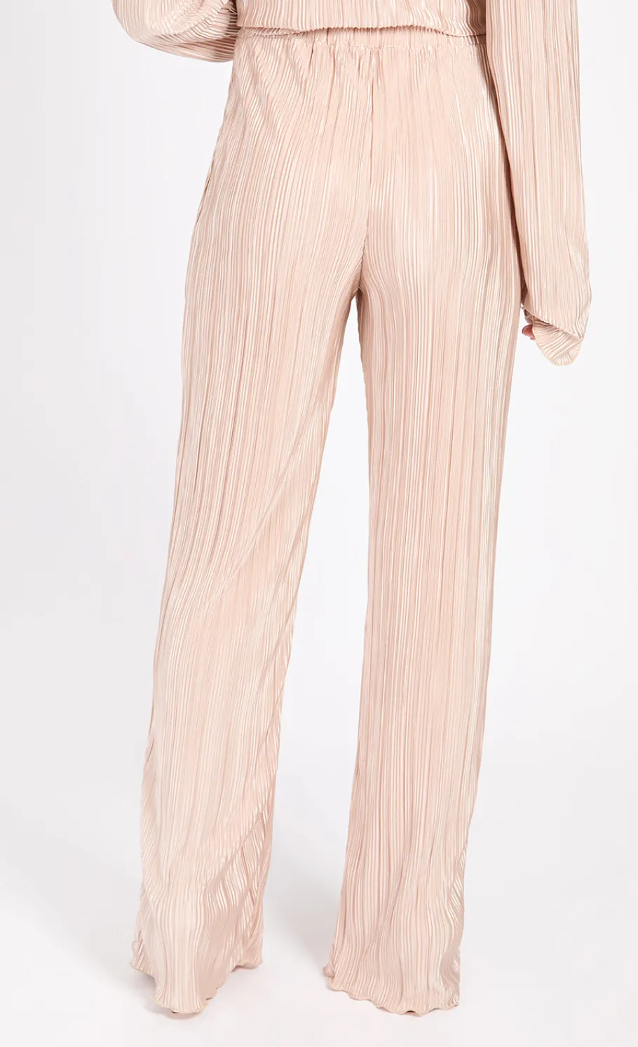 The Champagne Plisse Trousers are a chic and elegant addition to your wardrobe. Designed with a high waist and a flattering wide-leg silhouette, these trousers offer both comfort and style. The luxurious plisse fabric drapes beautifully, making them the perfect co-ord piece to pair with the matching top for a sophisticated, coordinated look.