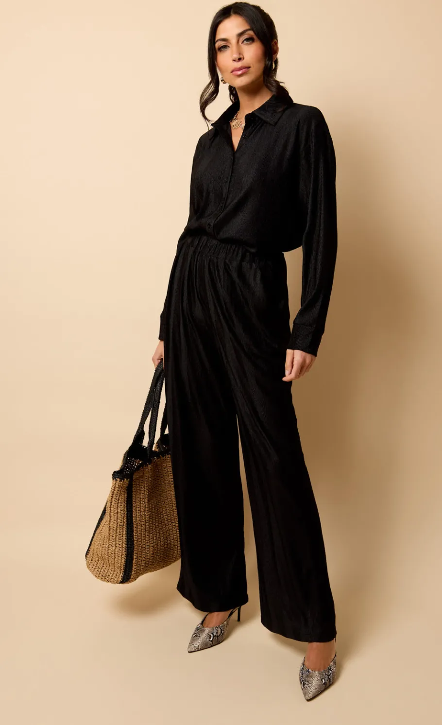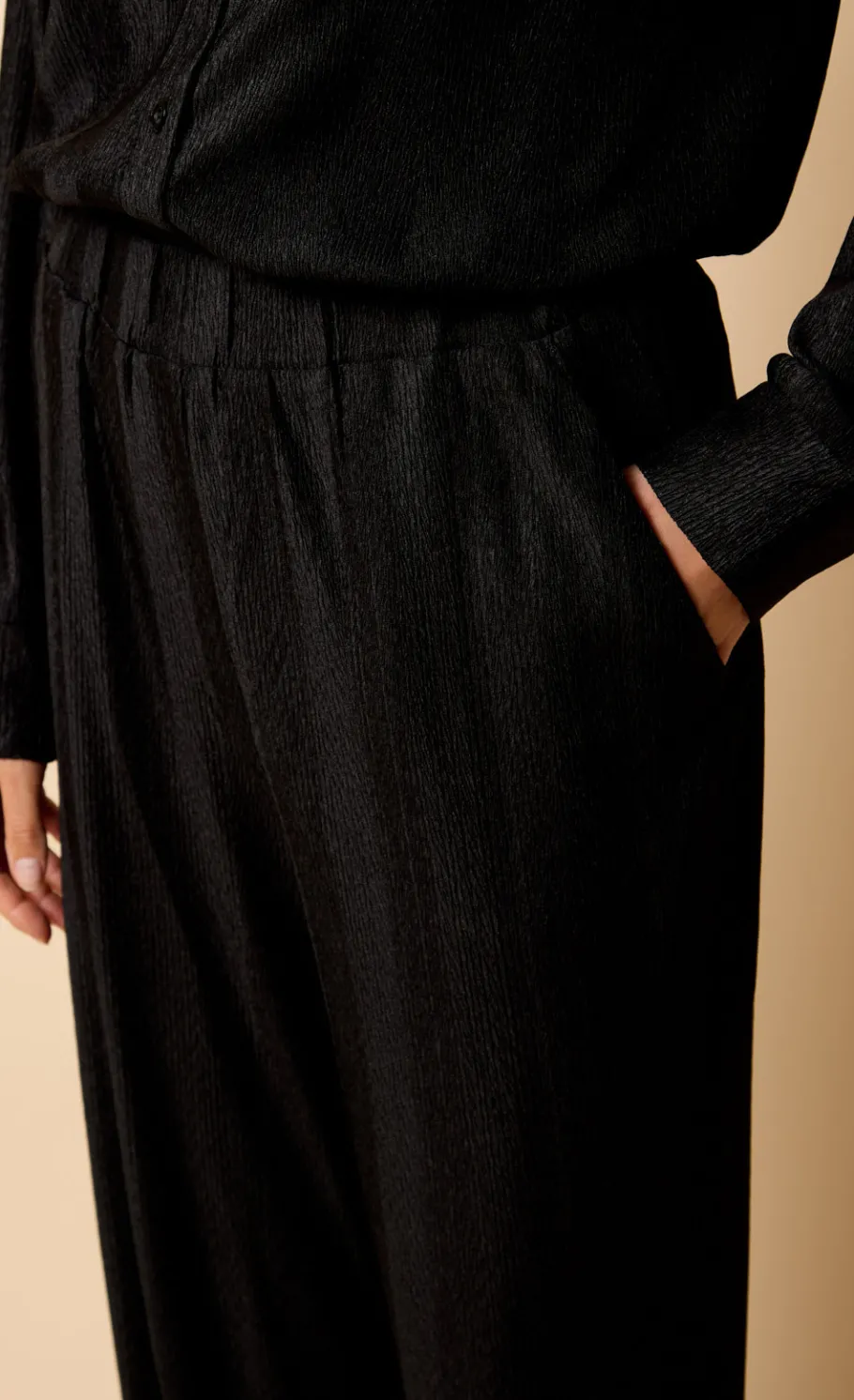 The Black Plisse Trousers feature a flattering high-waist design and a wide-leg fit, offering both comfort and style. With their regular length and versatile fit, these trousers pair effortlessly with the matching co-ord for a coordinated, chic look.