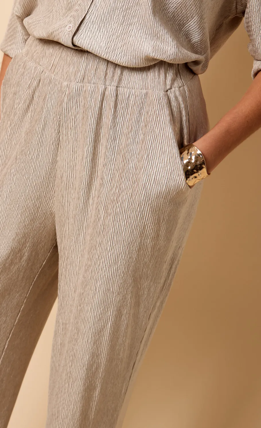 The Brown Plisse Trousers offer a stylish high-waist design and a relaxed wide-leg fit for a chic, comfortable look. Perfect for pairing with the matching co-ord, their regular length and versatile fit make them an essential addition to your wardrobe.