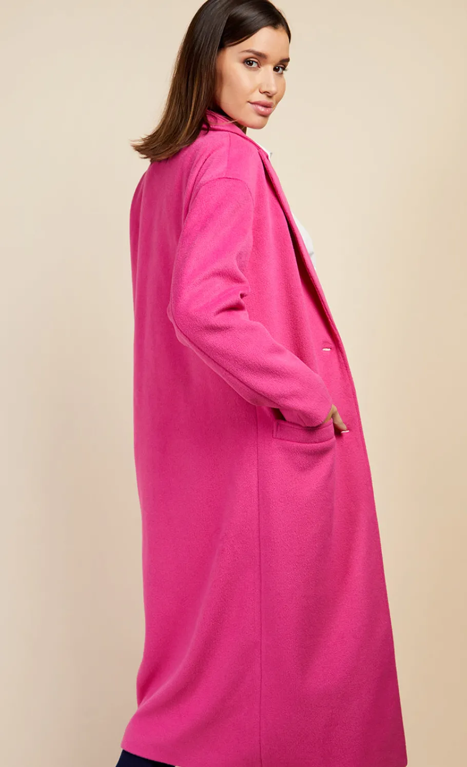 Oversized, single-breasted, wool blend coat in a candy pink hue. Featuring lapel collar, button closure and pockets at front. Relaxed fit.