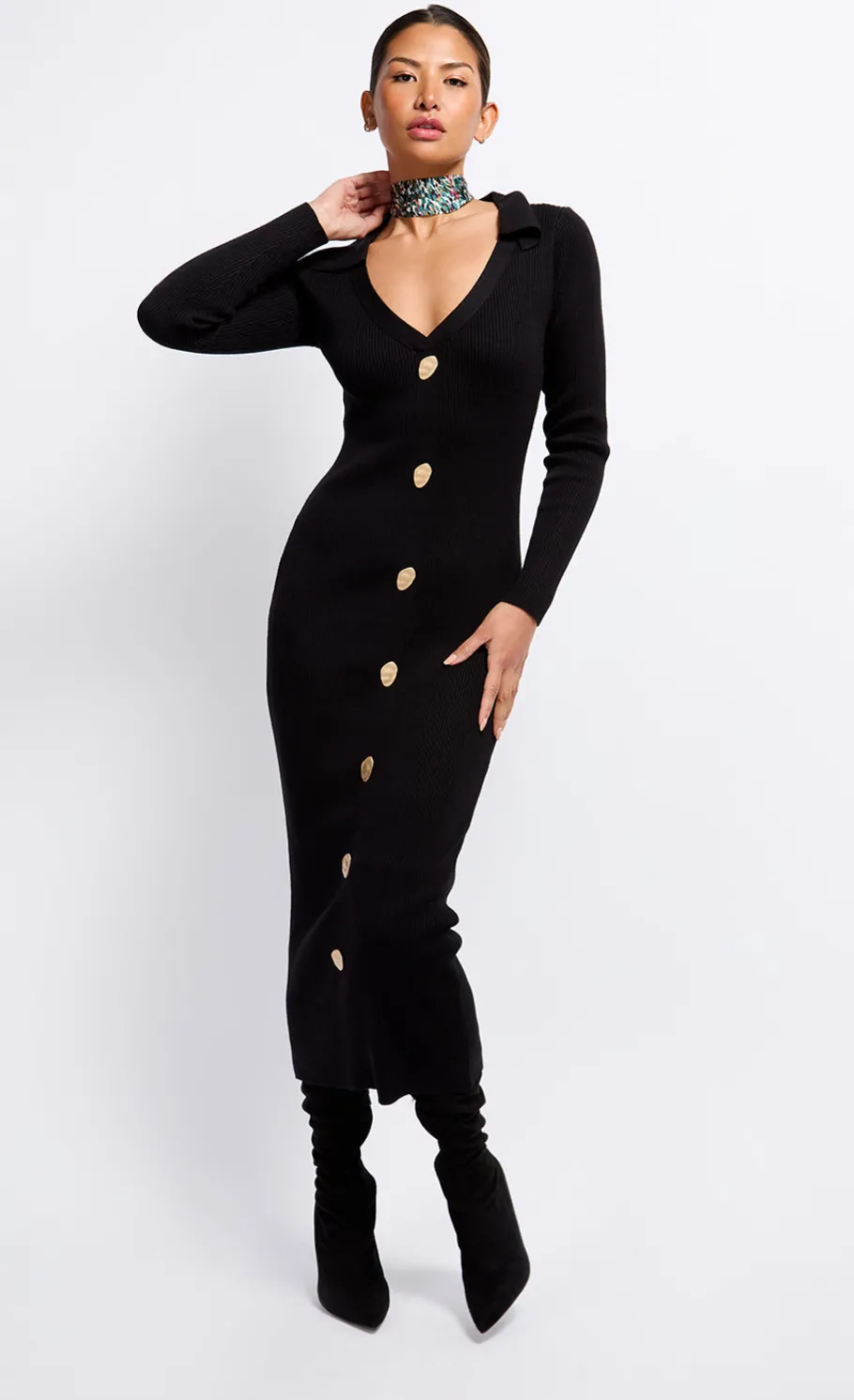 Introducing our Black Knit Midaxi Dress with Button Front Detailing, a perfect blend of comfort and sophistication. Crafted from soft knit fabric, this dress offers a cozy feel while maintaining a stylish silhouette. The timeless black colour complements any wardrobe, ideal for both casual outings and more formal occasions. Pair with boots or heels for an effortlessly chic look that transitions seamlessly from day to night.