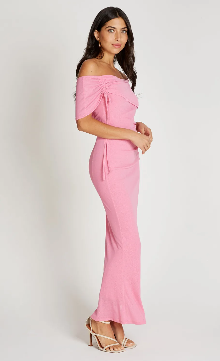The Pink Light Knit Bardot Midaxi Dress features a chic off-the-shoulder design with short sleeves, offering a regular fit and flattering A-line silhouette. Its midaxi length and soft knit fabric make it a stylish and comfortable choice for casual or semi-formal occasions.
