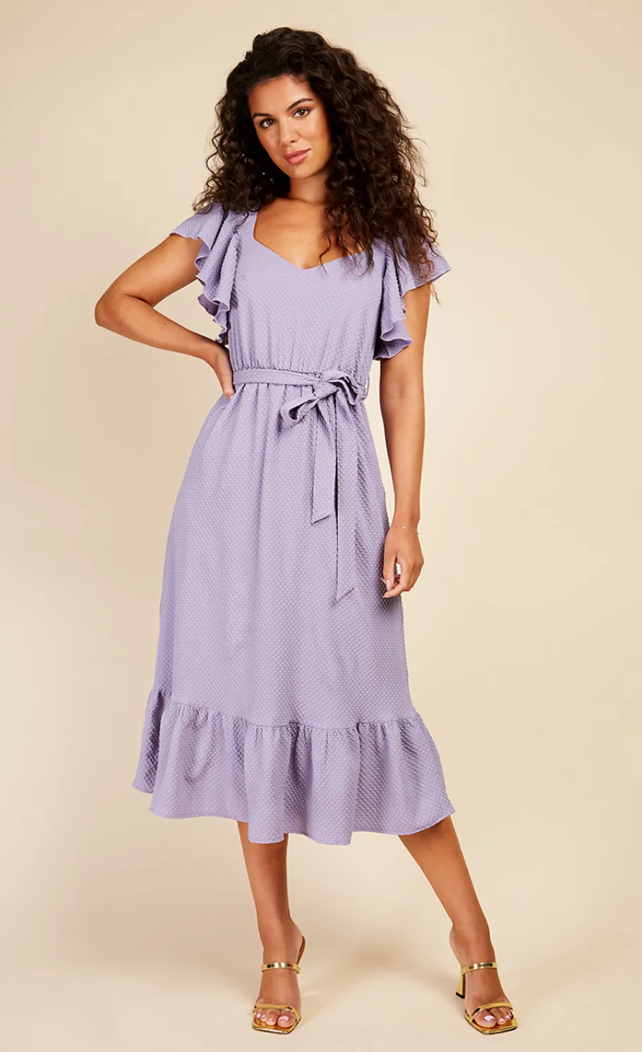 If spring were a dress. When you’ve stopped swooning over that lilac hue, take a moment for the sweetheart neckline, flouncy ruffles and tiered hem. Add wedges and a straw bag and pretend you’re wandering around a market in Provence.