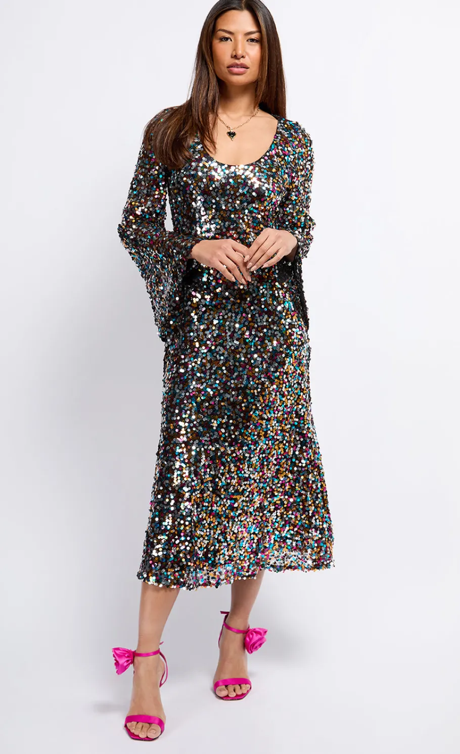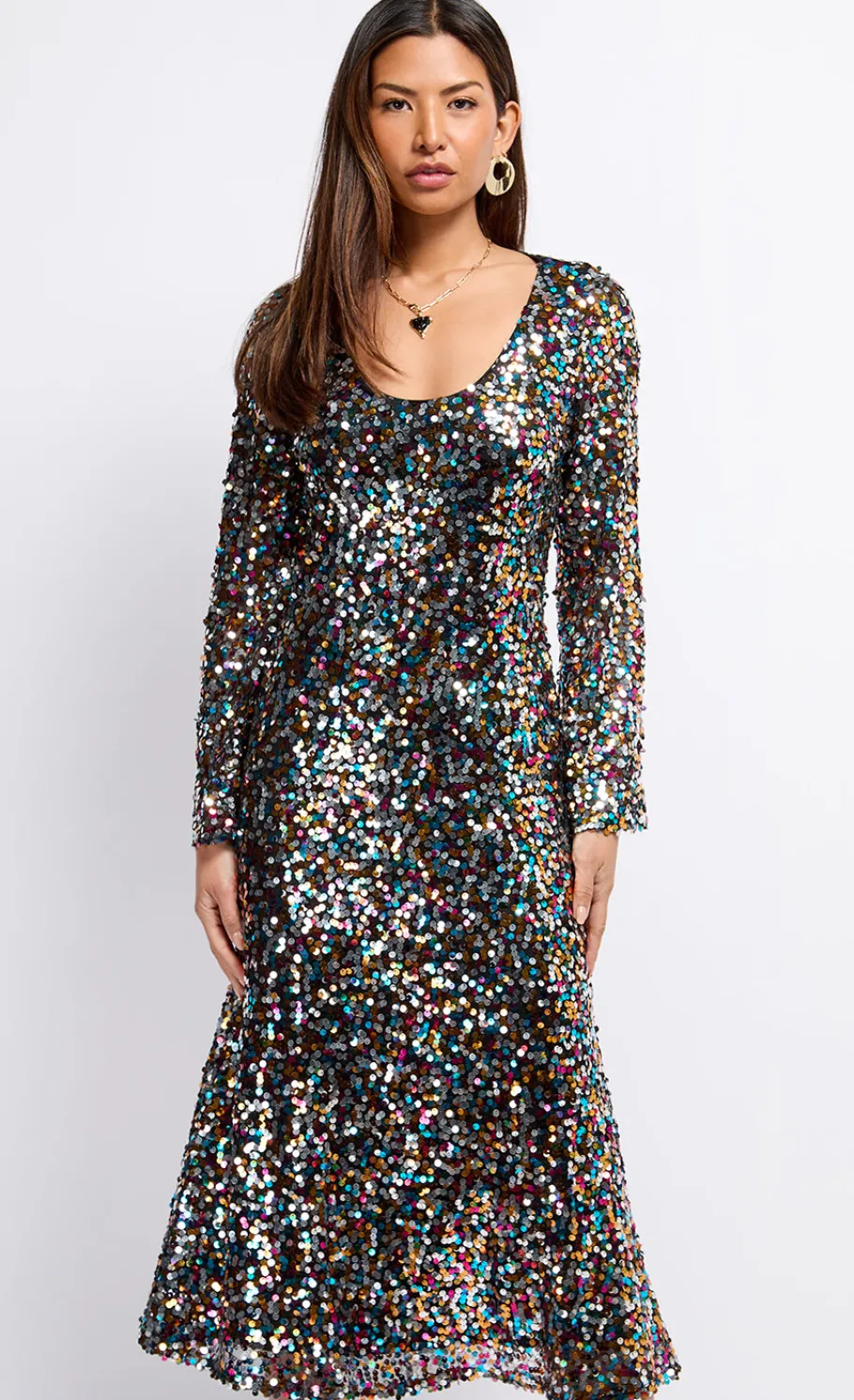 Make a statement in our Multi-coloured Sequin Midaxi Dress. This dazzling piece features a vibrant array of sequins that catch the light from every angle, ensuring you shine bright at any event. Perfect for parties or special occasions, this dress promises to turn heads with its bold colours and sparkling detail. Pair with minimalist accessories to let the dress take centre stage.