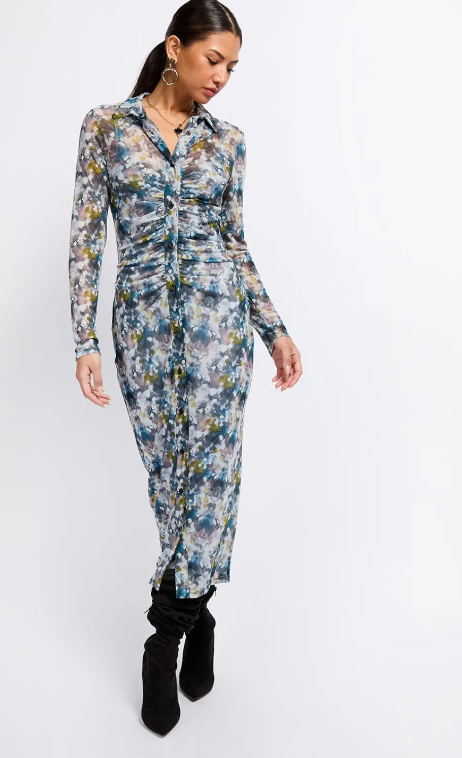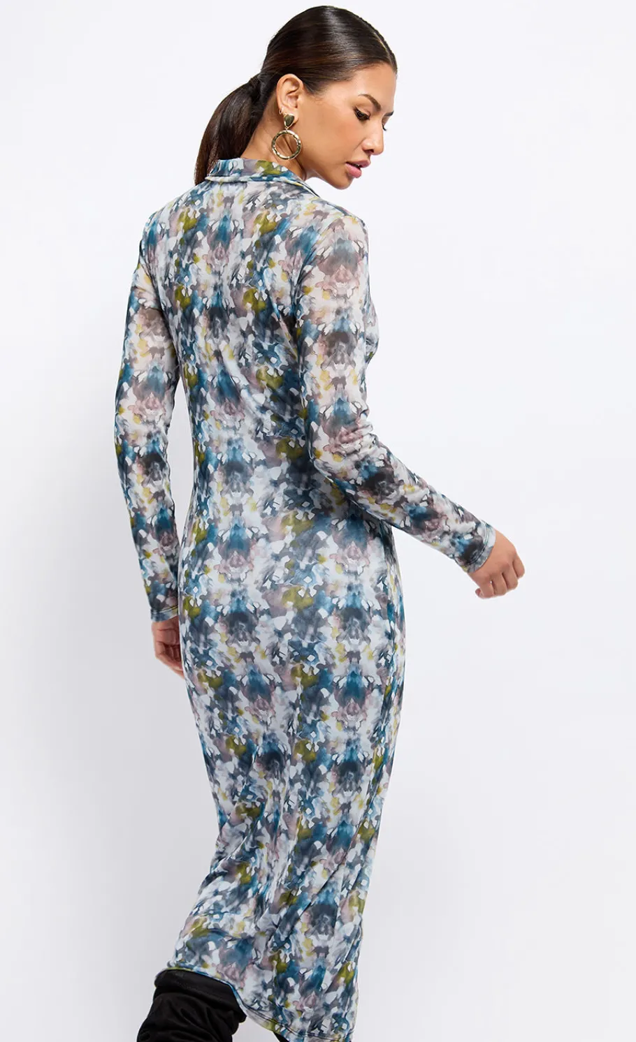 Make a statement this Autumn season. The classic shirt dress is given an update in printed mesh, simply throw-on-and-go, this fitted number is maximum impact, minimal effort! Featuring button-front detail, long sleeves and v-neck design, style with biker boots for an on-trend statement.
