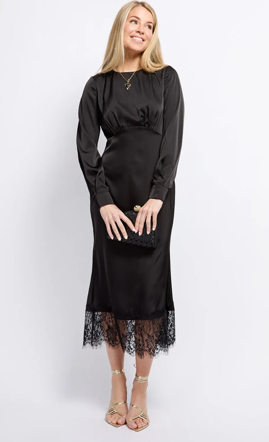 Crafted from luxurious satin, this dress features delicate lace detailing that adds a touch of romance. The classic black colour exudes sophistication, perfect for evening events or special occasions. The midaxi length offers a graceful silhouette, while the tailored fit flatters the figure. Pair with heels and minimal accessories for a timeless and chic ensemble that captures attention.