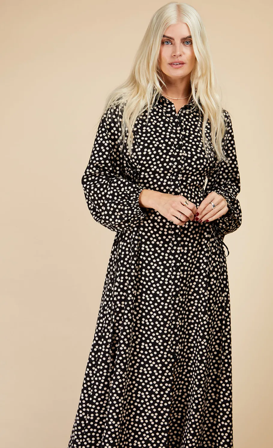 Dresses you can wear for work and play are the best kind of dresses. Cut in a classic shirt style with a waist-cinching lace-up side detail, blouson sleeves and monochrome spot print, this one looks as good with trainers and a biker as it does with heels and a clutch. Print placement may vary.