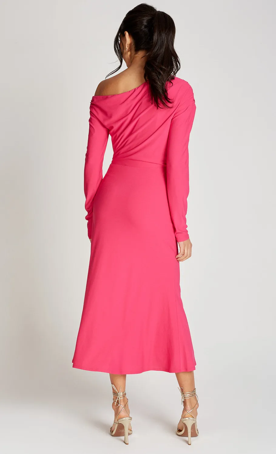 The Pink Asymmetric Neckline Midaxi Dress showcases a unique asymmetric neckline and long sleeves, offering a regular fit with an A-line shape. Its maxi length adds a touch of elegance, making it perfect for formal or evening events.
