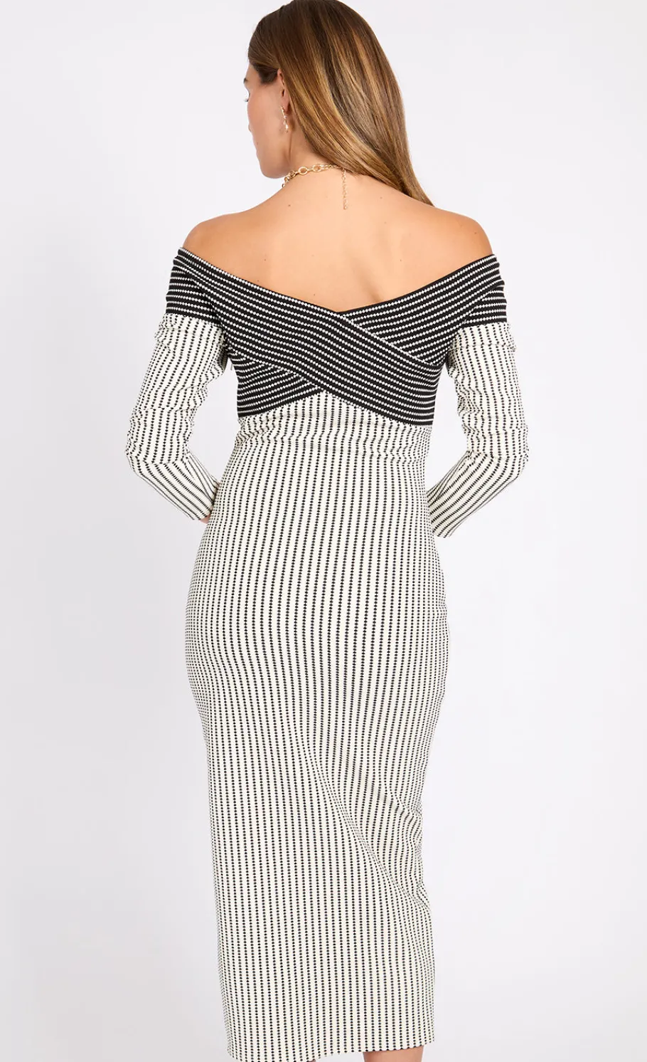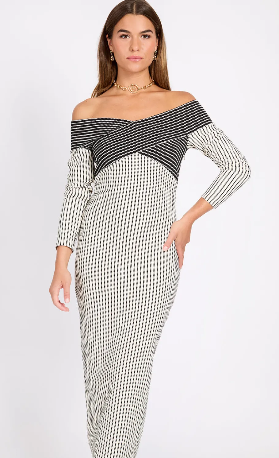 Make a bold statement in our Mono Textured Midaxi Dress, designed to offer both style and sophistication. Featuring an off-the-shoulder neckline and long sleeves, this fitted bodycon dress hugs your curves in all the right places. Crafted from soft jersey fabric, the midaxi length and textured design add a unique touch, making it a perfect choice for both casual and formal events.