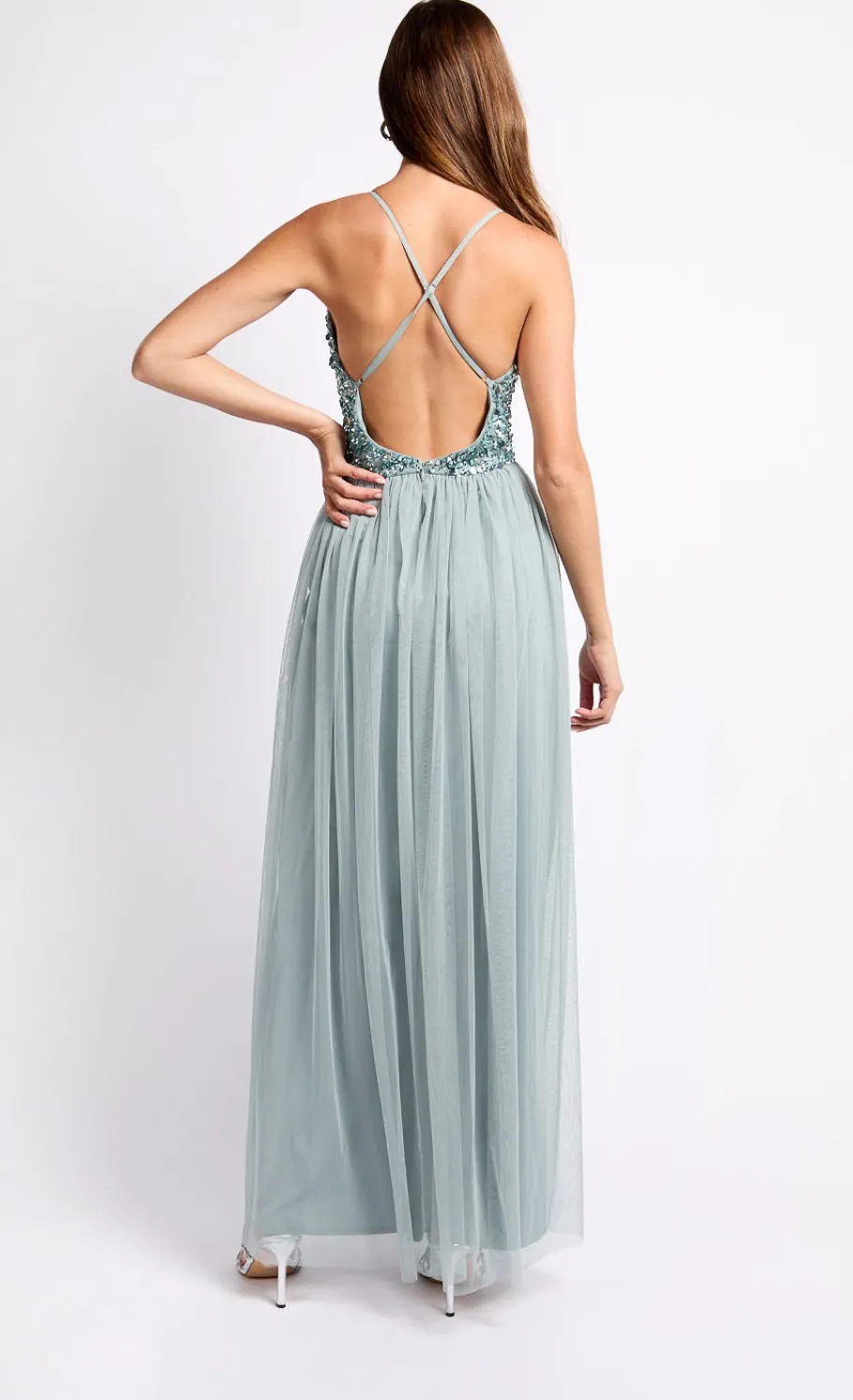Turn heads in this v-neck maxi dress, featuring a beautifully embellished top that adds a touch of sparkle. The flowing mesh skirt creates a graceful silhouette, while the cross-back detailing offers a striking and elegant finish. Ideal for evening events, this dress effortlessly blends style with sophistication.