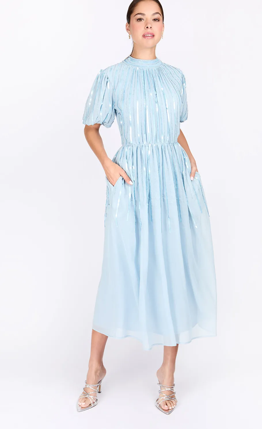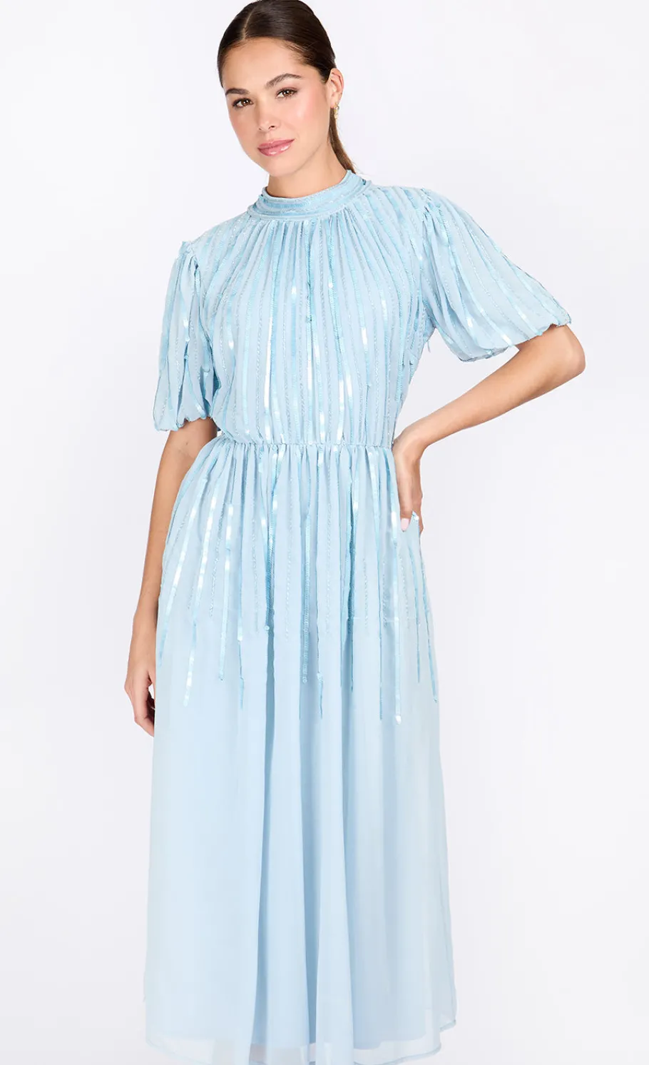 This dress features intricate embellishments that add a touch of glamour, making it ideal for any special occasion. Crafted in a captivating blue hue, it offers a flattering midaxi length that exudes sophistication and grace.