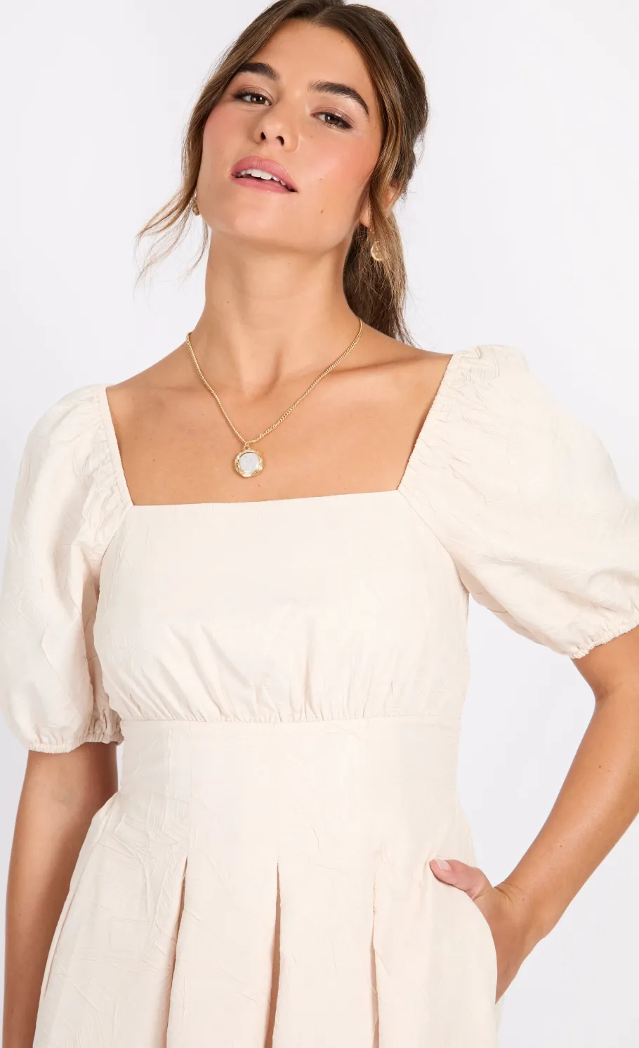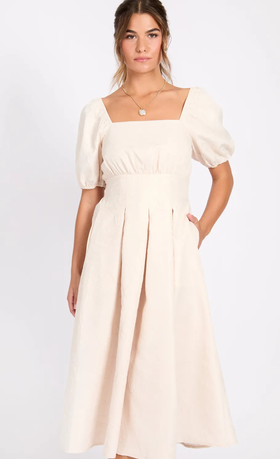 Embrace effortless elegance with the Cream Leaf Midaxi Dress, designed to offer both style and comfort. Featuring a delicate leaf pattern in a soft cream hue, this dress offers a timeless and versatile look for any occasion. Its flattering midaxi length, square neckline, and lightweight jacquard fabric ensure you stay chic and comfortable all day long.