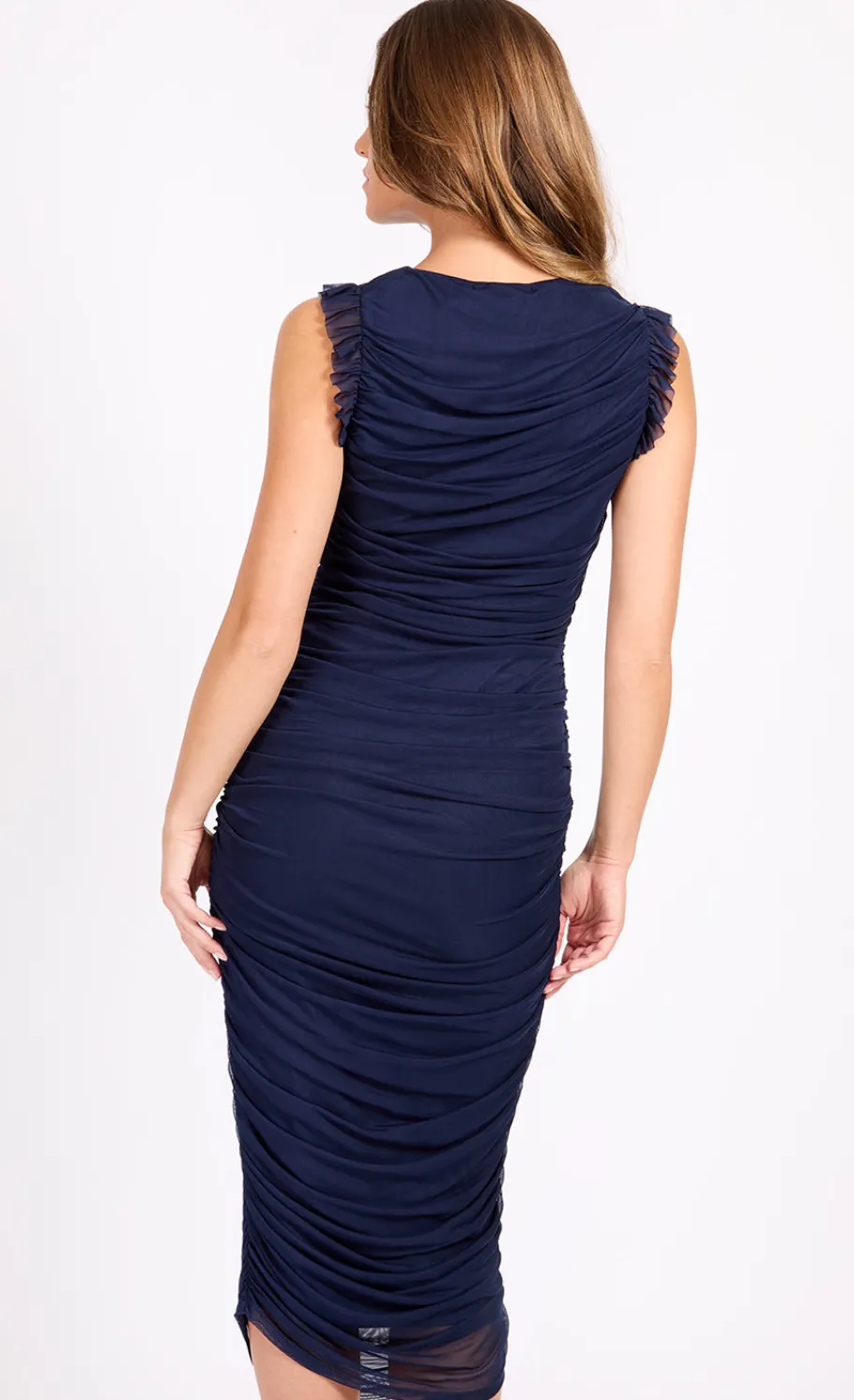 The Navy Mesh Midaxi Dress combines elegance with a modern touch. Featuring a round neck and sleeveless design, this fitted dress offers a sleek bodycon silhouette that hugs your curves beautifully. With its midaxi length and breathable mesh fabric, it’s perfect for any event that requires both style and comfort.