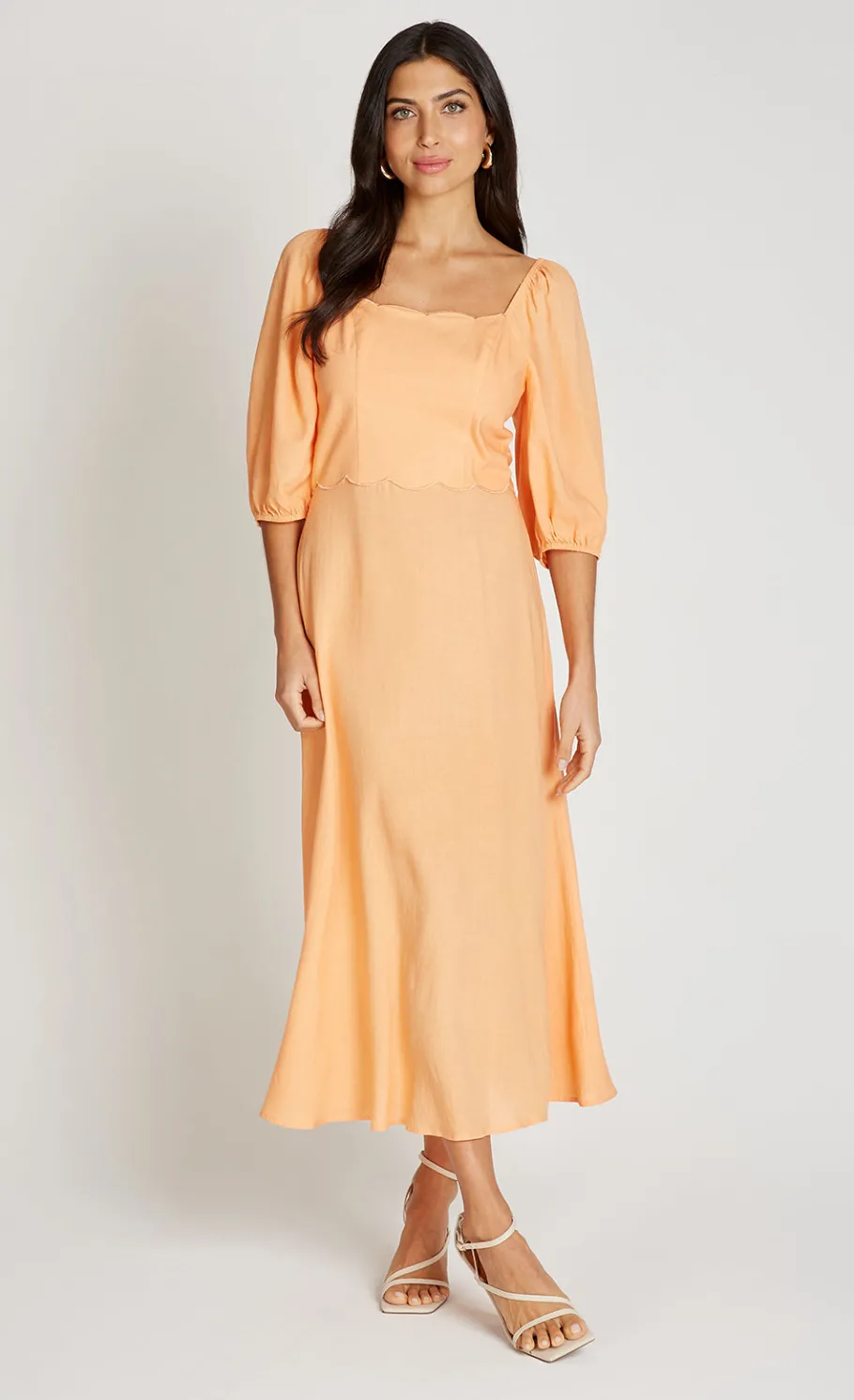 The Orange Midaxi Dress With Linen features a fresh square neckline and short sleeves, offering a comfortable regular fit with a flattering A-line silhouette. Its midaxi length and lightweight fabric make it a perfect choice for warm-weather occasions or casual outings.