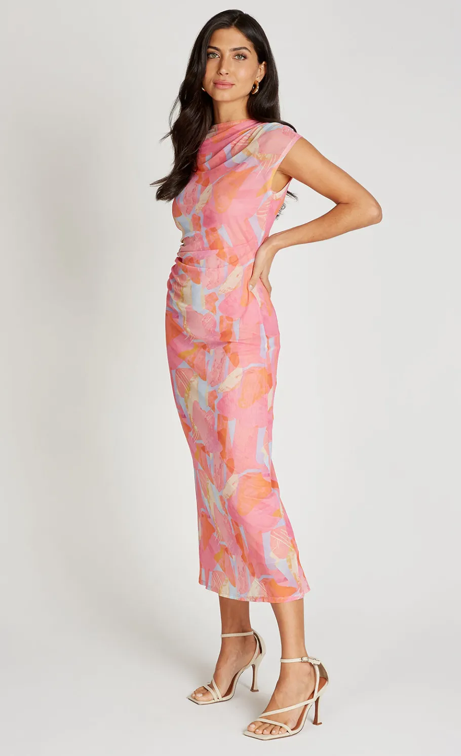 The Pink Print Mesh Midaxi Dress features a classic round neckline and sleeveless design, offering a regular fit with a flattering A-line silhouette. Its midaxi length and vibrant print on mesh fabric create a stylish, lightweight look perfect for warmer days or casual outings.