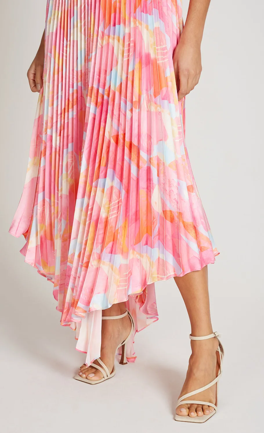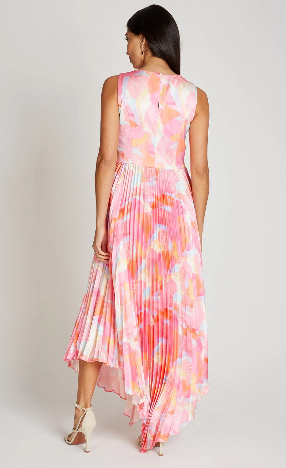 The Pink Print Satin Pleated Midaxi Dress features a flattering V-neck and sleeveless design, offering a regular fit with an A-line silhouette. Its midaxi length and satin pleats add a touch of elegance, making it perfect for both casual and semi-formal occasions.