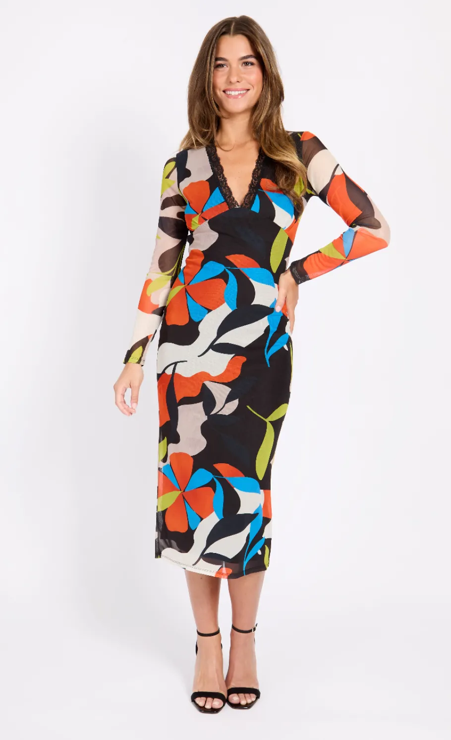 Turn heads in our Printed Mesh Midaxi Dress, a stunning piece designed to make an impression. Featuring a bold print, flattering bodycon fit, and elegant V-neckline, this dress is perfect for special occasions. The lightweight mesh fabric with lace accents adds a touch of glamour while ensuring all-day comfort.