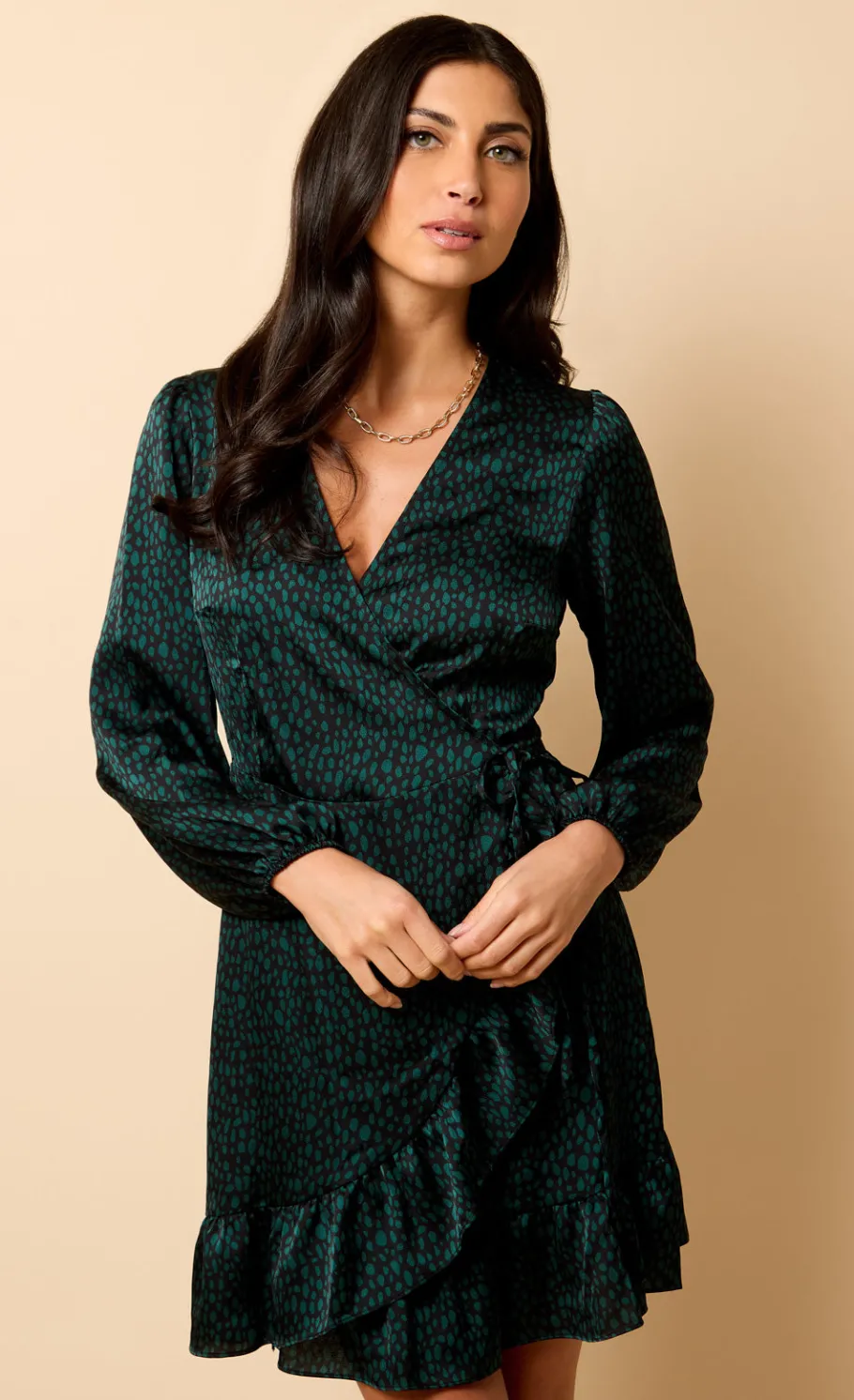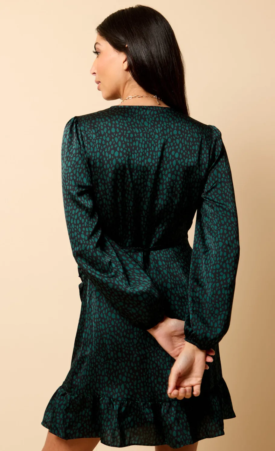Make a bold statement in this green animal print mini dress. Designed with a flattering V-neckline and a stylish tie wrap front, it enhances your shape while offering all-day comfort. The long sleeves and regular fit make it perfect for day-to-night styling. Finished in a chic A-line silhouette and mini length, it’s your go-to for effortless glam.