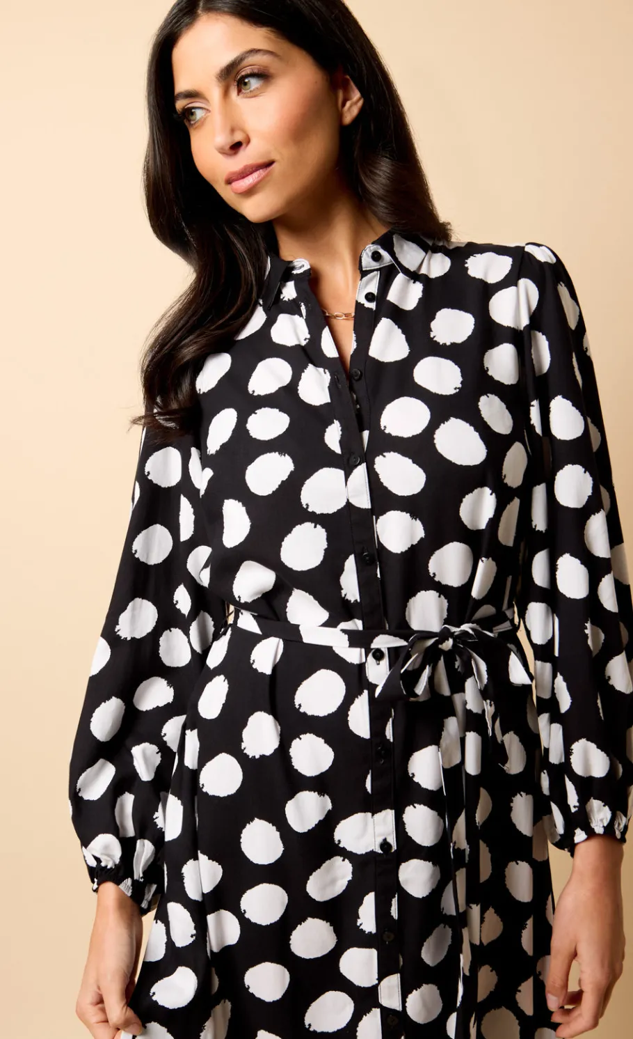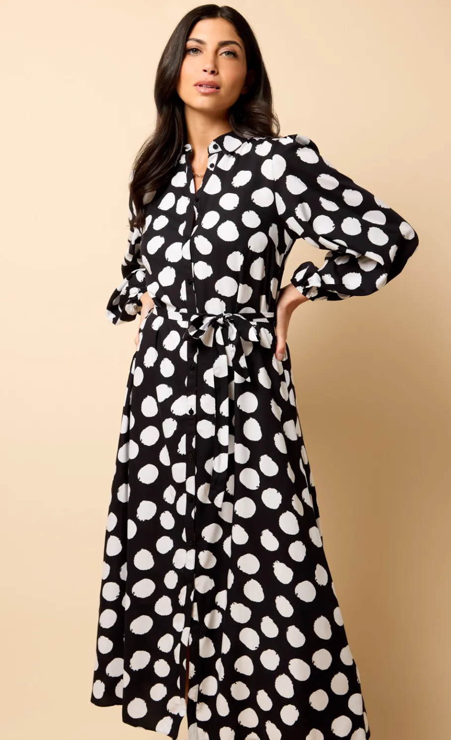 Timeless and chic, the Long Sleeve Midi Shirt Dress in black and white spot print features a classic collar neck and flattering A-line silhouette. The tie waist cinches the figure for a tailored look, while the regular fit and midi length offer all-day comfort and elegance. Perfect for work or weekend wear, this spot print dress adds effortless sophistication to any wardrobe.