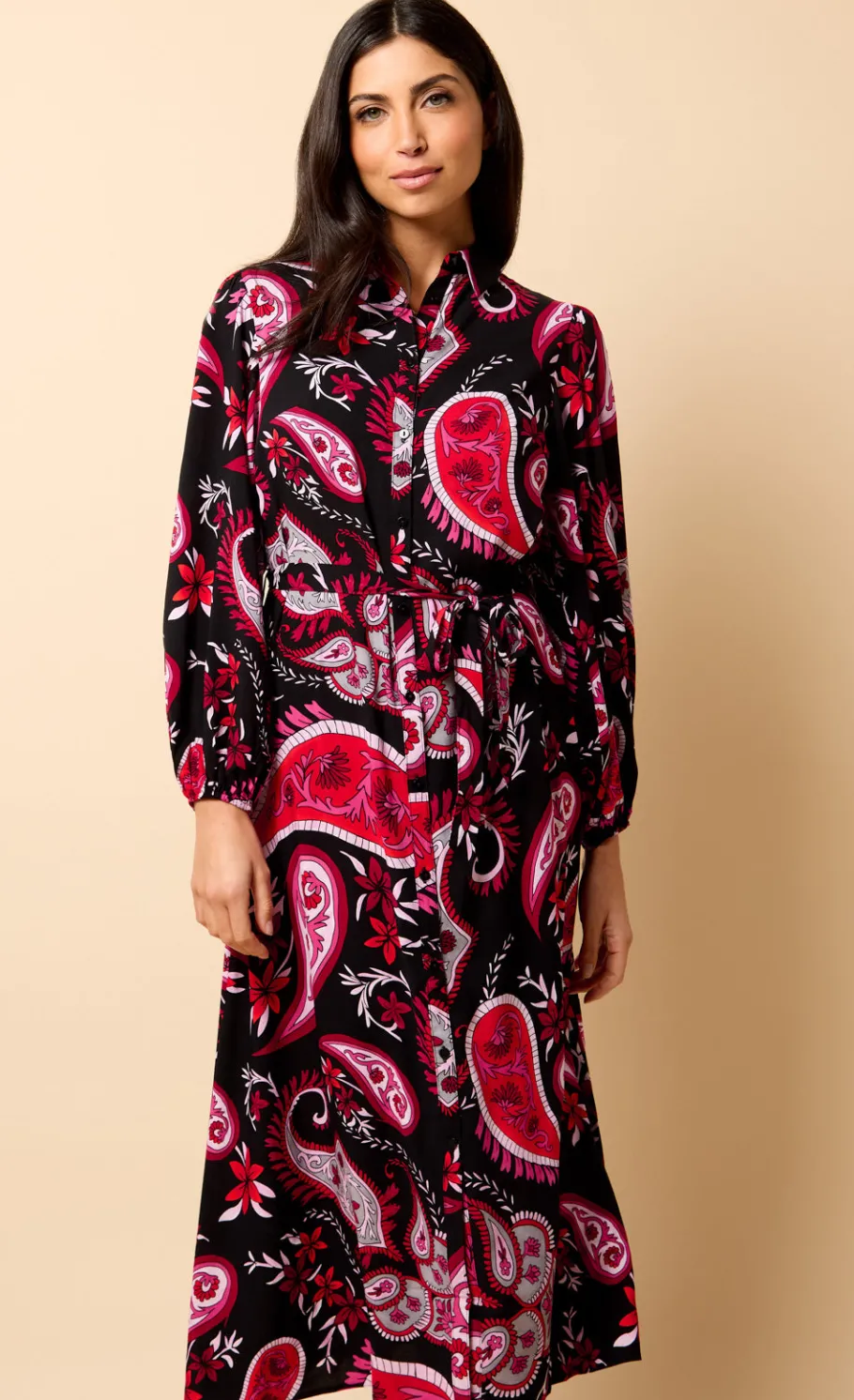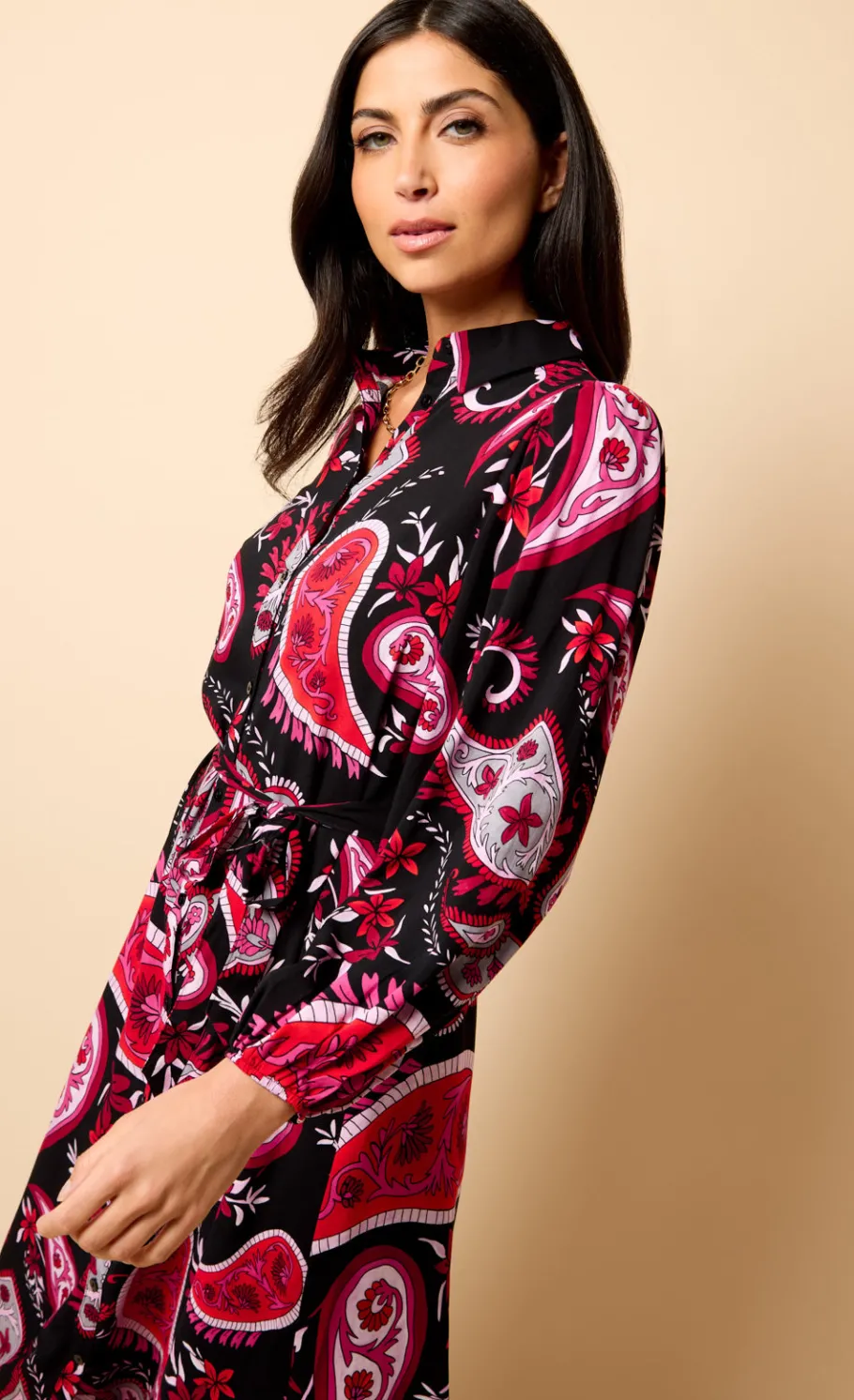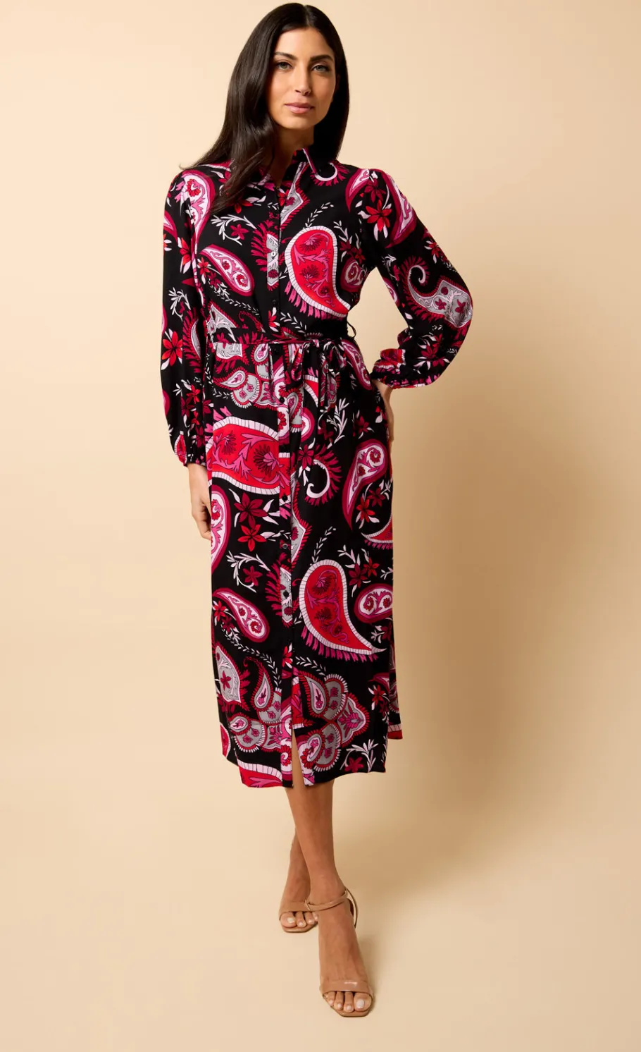 Make a stylish statement in the Long Sleeve Midi Shirt Dress, featuring a bold large paisley print and a flattering V-neckline. Designed with a tie waist to enhance your silhouette, this A-line midi dress offers a regular fit and long sleeves for a polished yet effortless look. Perfect for workdays or weekends, it blends timeless shirt dress style with standout print appeal.