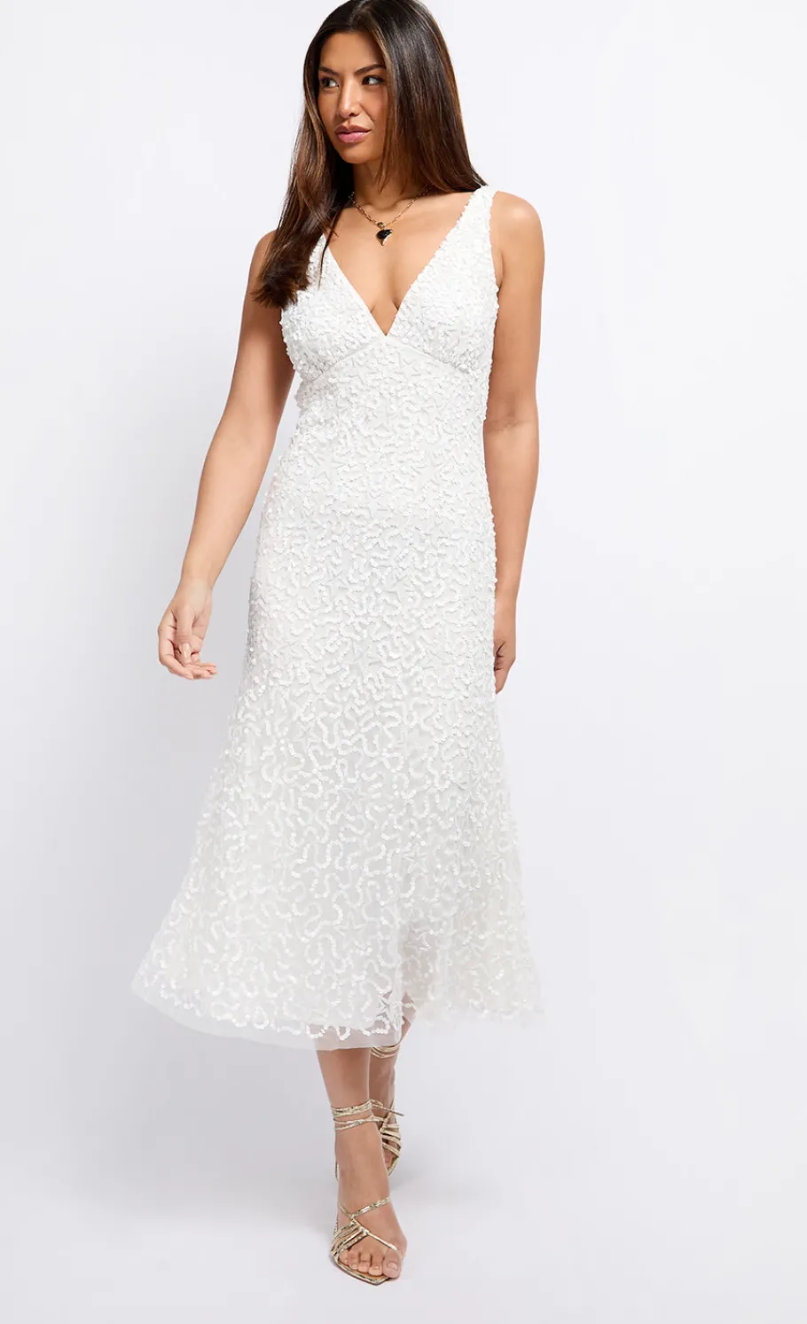 Shine bright in our Cream Star Sequin Midi Dress. This enchanting piece features delicate star-shaped sequins that shimmer with every movement, creating a celestial allure. The creamy hue adds a touch of elegance, while the midi length offers a flattering silhouette. Perfect for special occasions, the dress combines charm and sophistication effortlessly. With its timeless design and flattering fit, it’s destined to be a standout in your wardrobe. Pair with heels and minimal accessories for a captivating look that dazzles all night long.