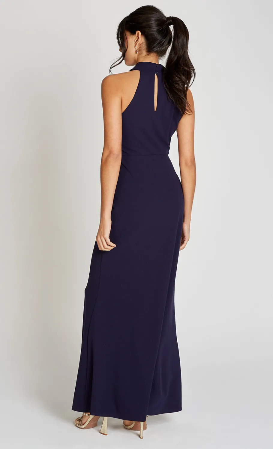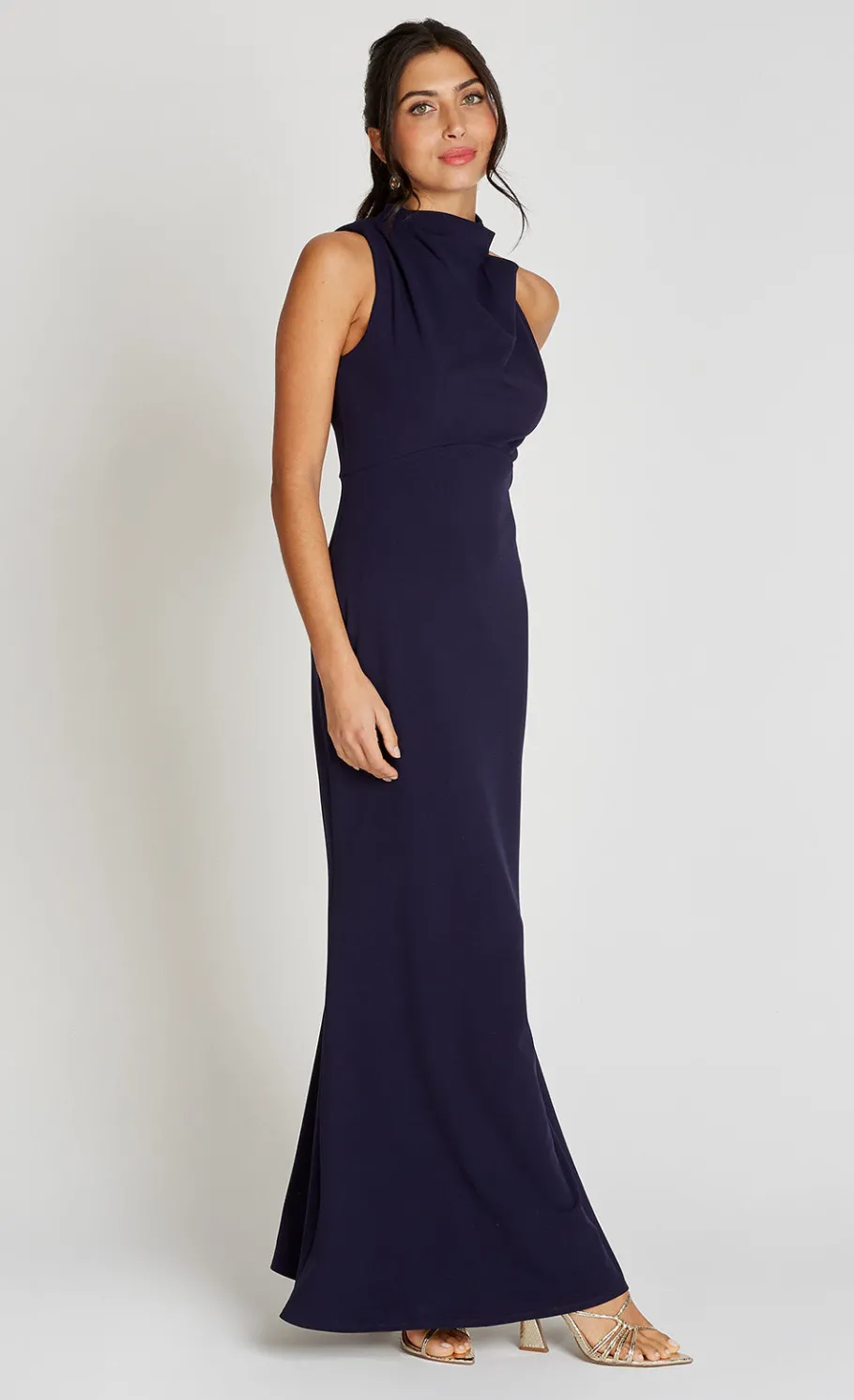 The Navy Drape High Neck Maxi Dress features a sophisticated high neck and sleeveless design, offering a regular fit with a flattering A-line silhouette. Its maxi length adds a graceful touch, making it perfect for elegant occasions or evening wear.