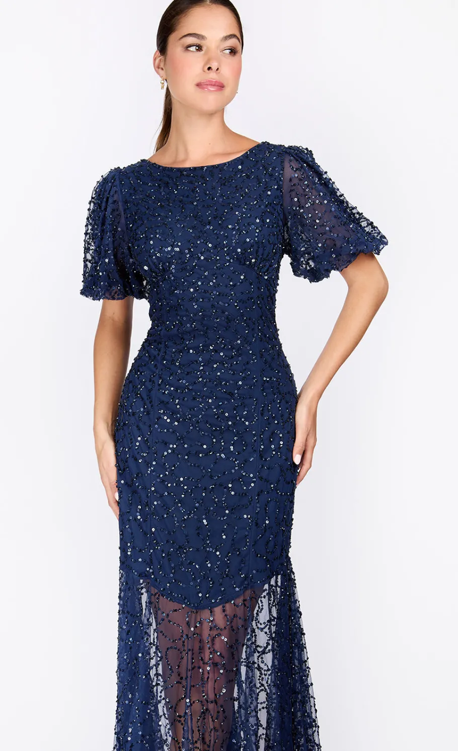 Dress features intricate embellishments that add a touch of glamour, making it ideal for special occasions. Crafted in a rich navy hue, it offers a flattering silhouette that complements any figure.