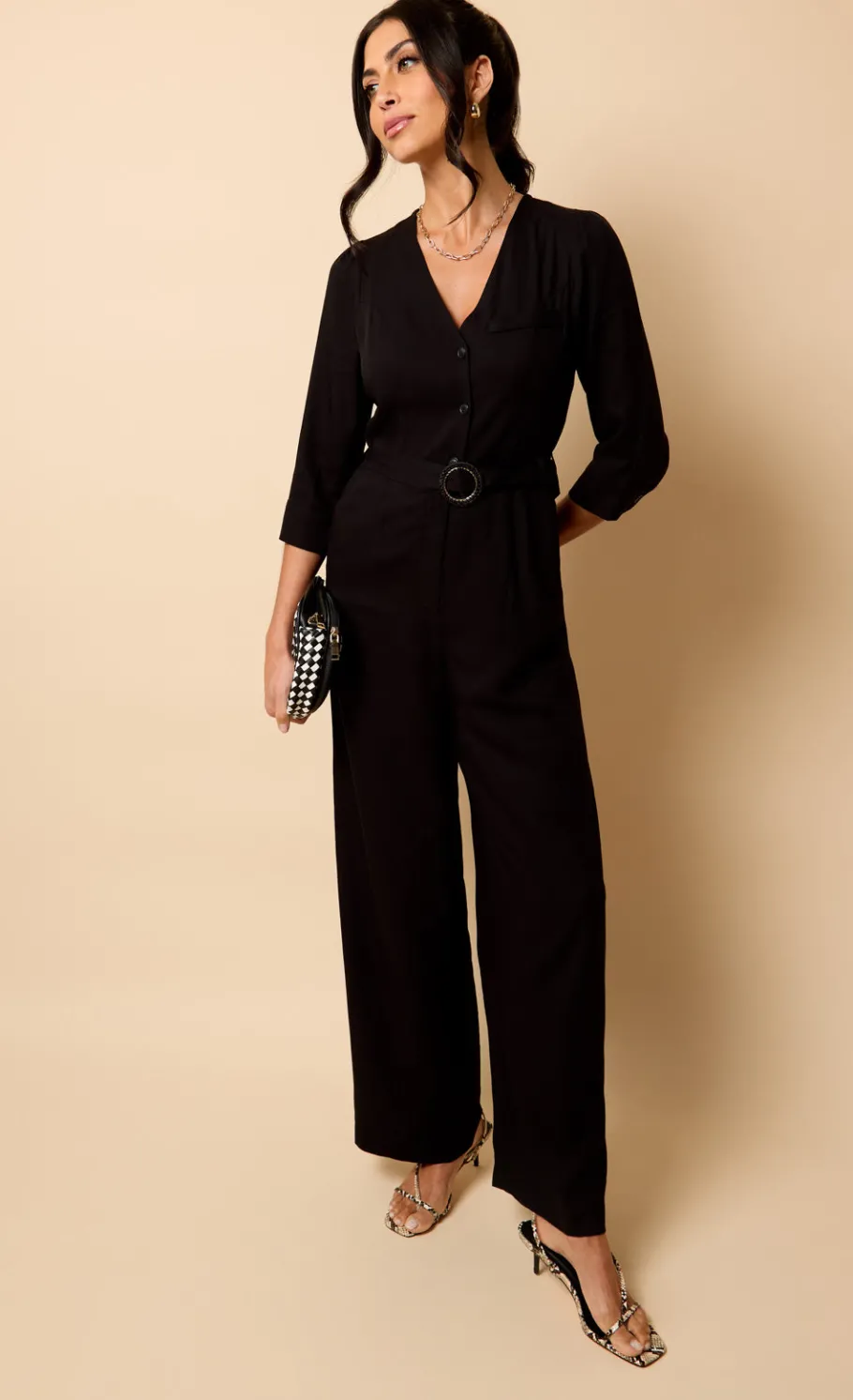 Embrace effortless style with this Black Jumpsuit, featuring a flattering V-neckline and relaxed wide-leg silhouette. Designed with half-length sleeves and a regular fit, it’s the perfect blend of comfort and sophistication for any occasion.