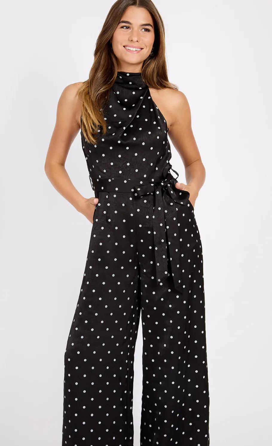 The Polka Dot Satin Jumpsuit is a chic and modern piece that combines sophistication with a playful twist. Featuring a high neck and sleeveless design, this jumpsuit offers a flattering regular fit and a comfortable wide-leg silhouette. The satin fabric enhances the luxurious feel, while the polka dot pattern adds a fun, retro-inspired touch, making it perfect for both casual outings and evening events.