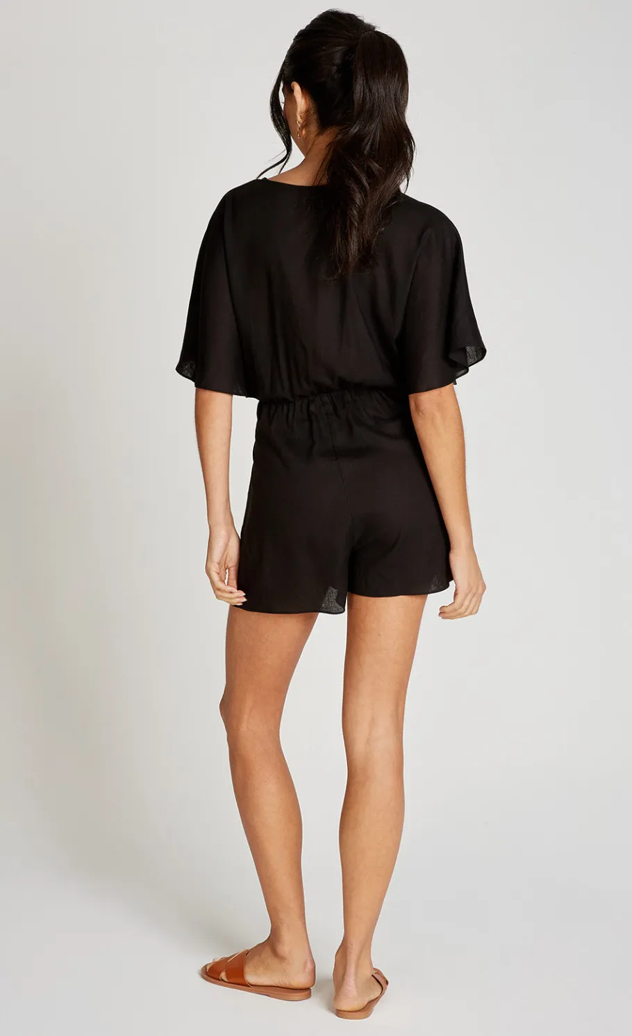 The Black Playsuit With Linen combines effortless style with comfort, featuring a flattering V-neck and short sleeves. Made with lightweight linen, it offers a regular fit with a chic wide-leg design and short length, perfect for warm-weather days and casual outings.