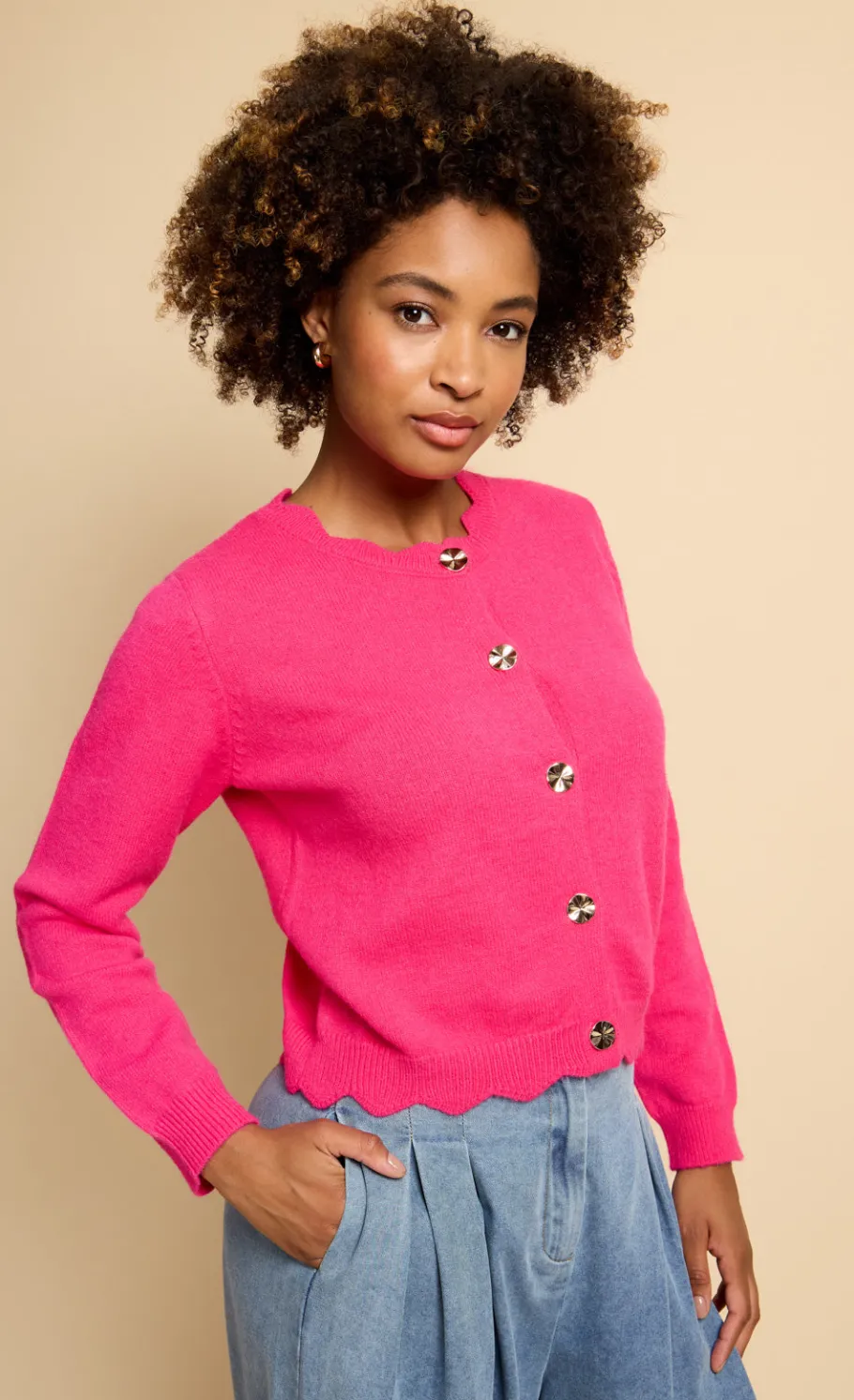 The Pink Knit Cardi is a cozy yet stylish piece that adds a pop of colour to your wardrobe. Featuring a round neck and long sleeves, this cardigan offers a regular fit and length, making it perfect for layering over casual outfits. Its soft knit fabric ensures comfort while keeping you chic on cooler days.