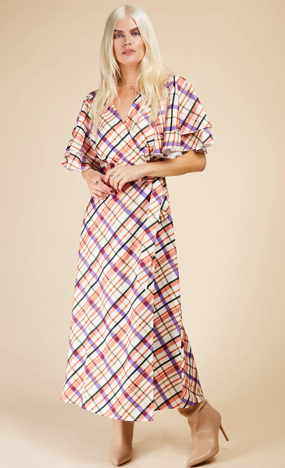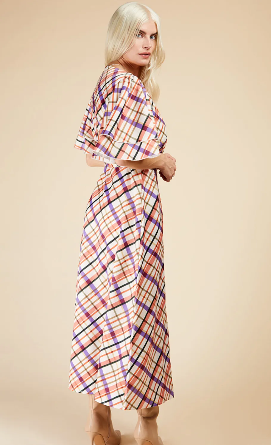 Nothing says spring like pastel checks. This midi is cut from slinky satin fabric that drapes over your figure and ties elegantly at the waist. Finished with dreamy angel sleeves, it’s perfect for that special event, but will look cool with trainers and a denim jacket too. Print placement may vary.