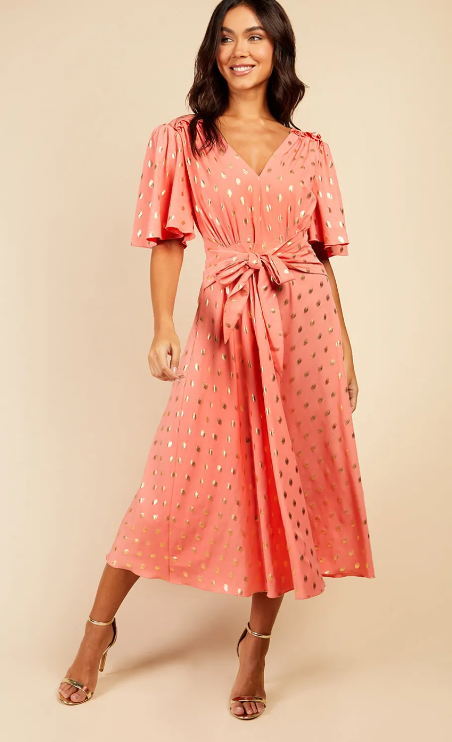 Say hello to the coral midi dress, adorned with gold spot pattern and tie-waist detail for a new season take on the classic summertime fit-and-flare midi. Pair with a strappy flat sandal for a more casual daytime look and amp up the glamour for evening events with statement earrings and heels.