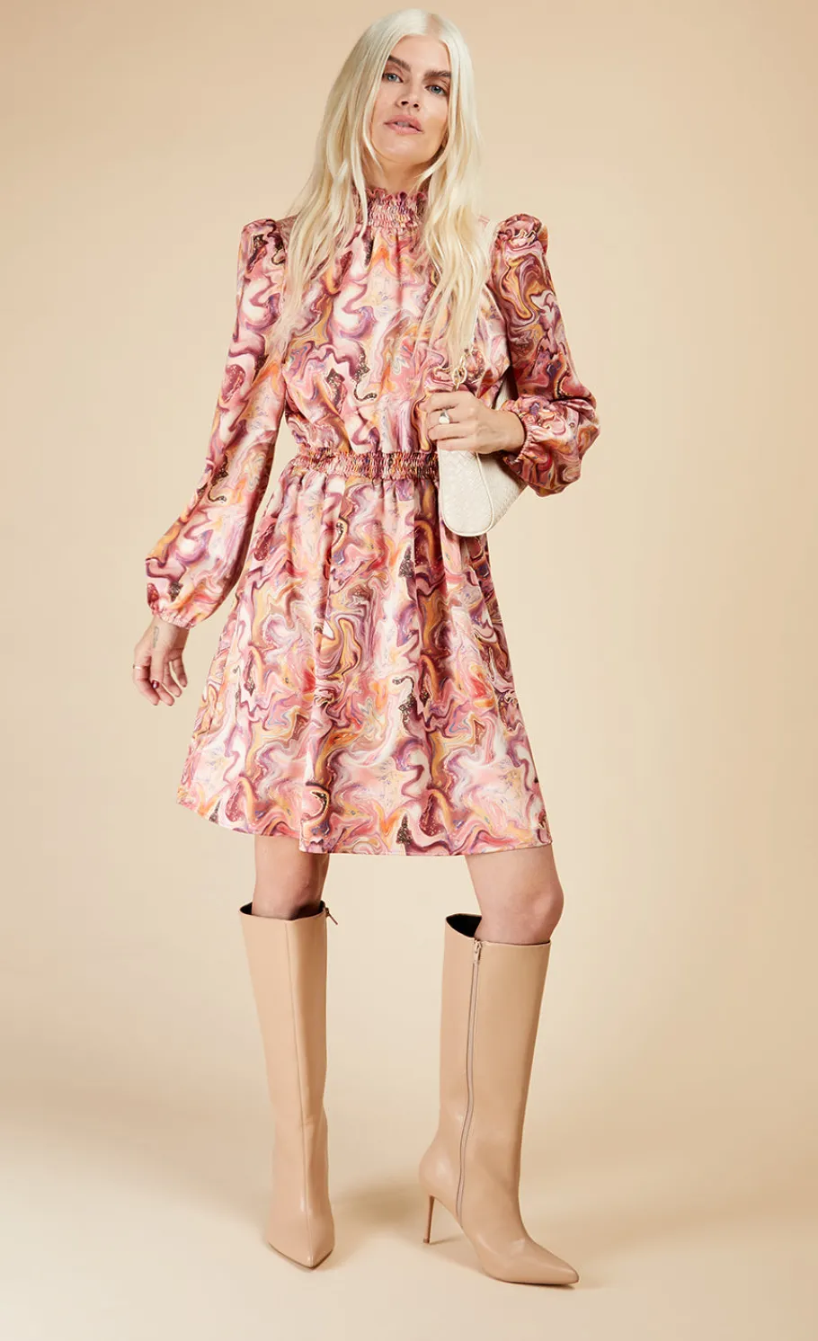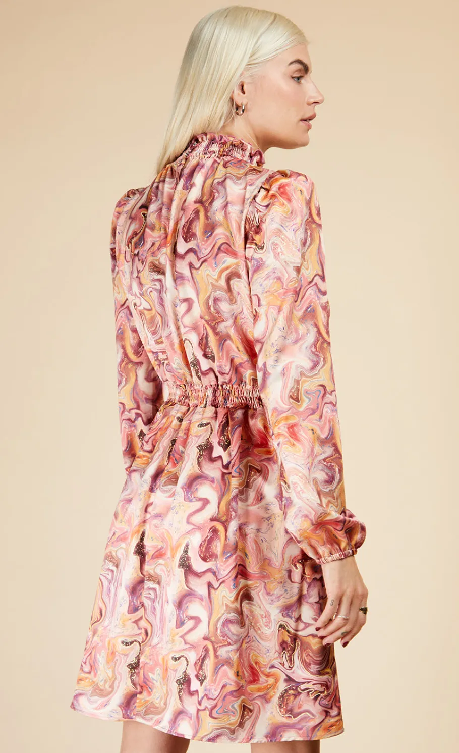 Pairing a psychedelic print with puffed blouson sleeves, this groovy mini is giving us major 1970s vibes. A chic shirred neck and waist add a contemporary twist. Add platforms and take that flippy hem for a spin on the dance floor. Print placement may vary.