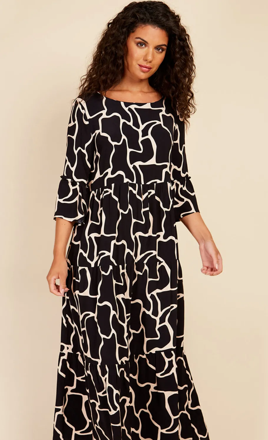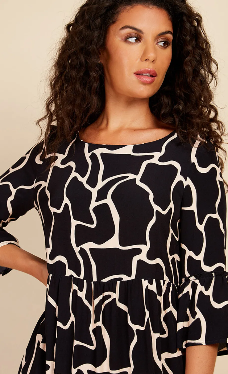 Like your dresses comfy and chic? We’ve got you. Cut in a tiered smock style, this throw-on-and-go midi isn’t short on outfit-elevating details. Giraffe print, V-back and fluted sleeves, we’re looking at you. Style with boots, trainers, strappy heels and sandals – the options are endless. Print placement may vary.