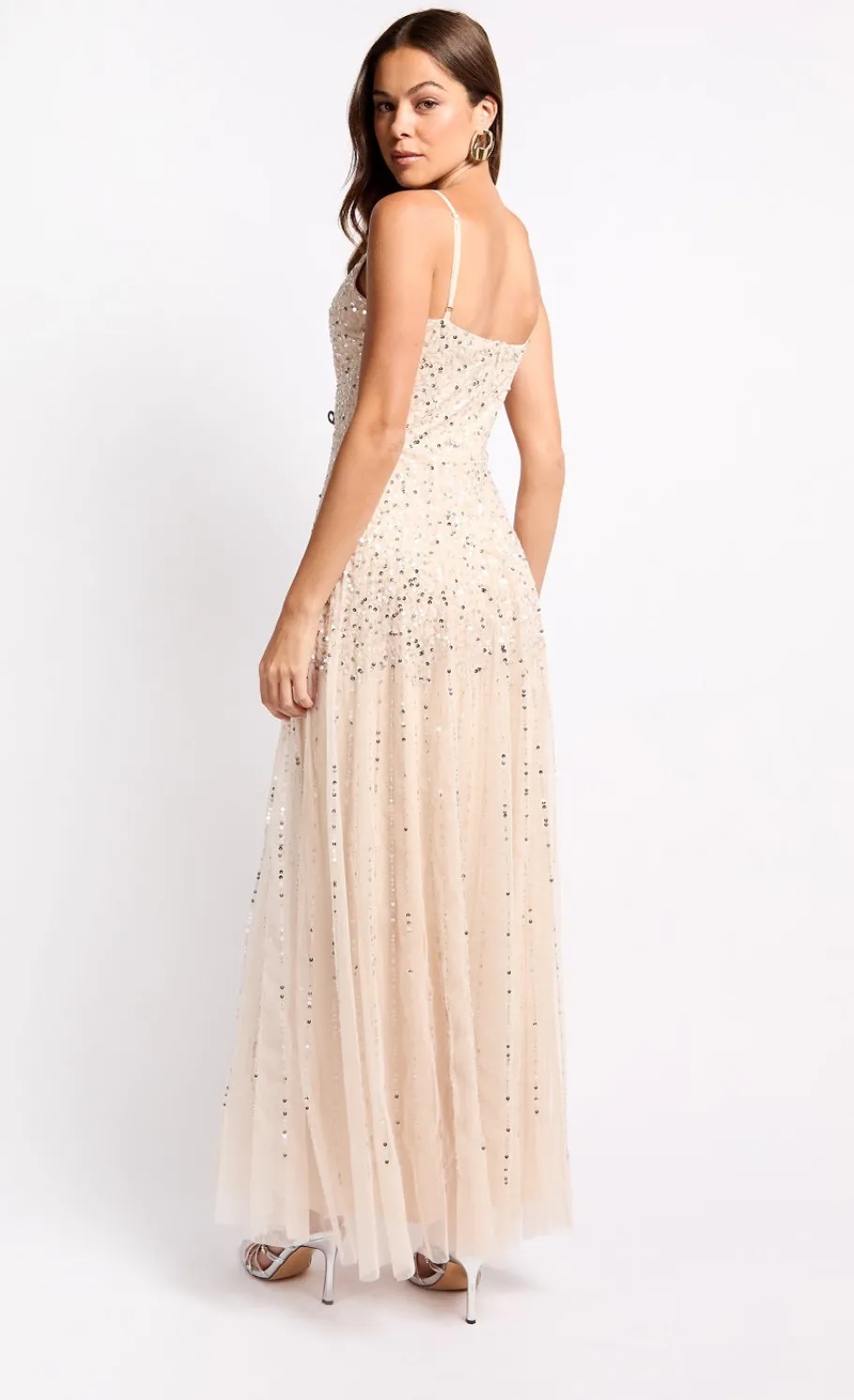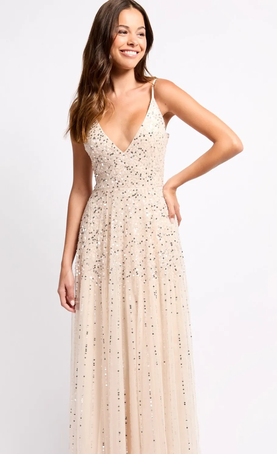 Embrace elegance with this cream v-neck maxi dress, featuring a delicately embellished top that sparkles with every movement. The mesh skirt flows gracefully, adorned with cascading sequin embellishments for a stunning effect. Perfect for special occasions, this dress offers a blend of timeless beauty and modern sophistication.