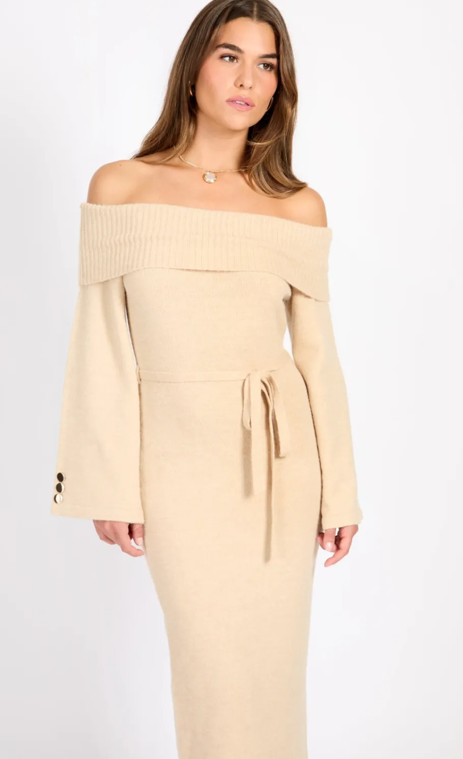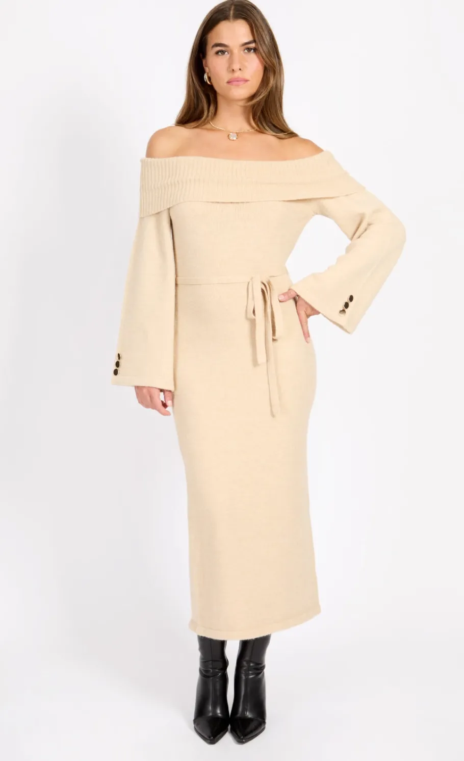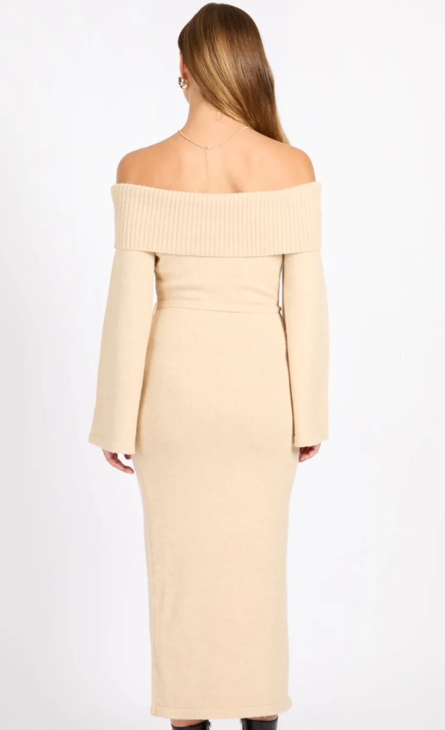 Think cozy elegance with our Oatmeal Knit Bardot Midi Dress, a perfect blend of comfort and style. This chic dress features a soft oatmeal hue that exudes warmth and sophistication, making it a versatile addition to your wardrobe. The Bardot neckline beautifully frames your shoulders, while the knit fabric ensures a snug and flattering fit. The midi length offers a timeless silhouette, perfect for both casual and semi-formal occasions. Crafted from high-quality knit material, this dress provides ultimate comfort and a refined look.