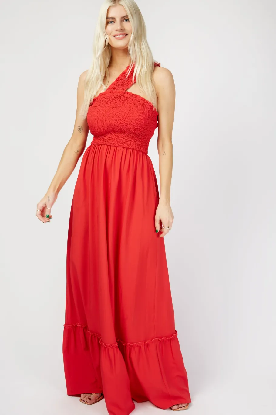 Hola señorita! Fusing style, comfort and plenty of sass, this standout summer dress features an asymmetric neckline, shirred bodice and tiered maxi hem. Just add gold hoops and a glass of sangria.