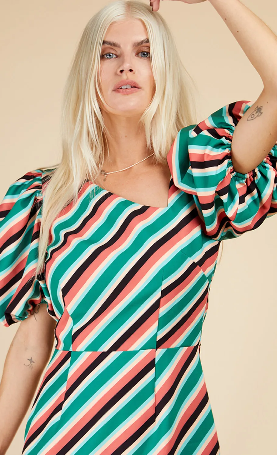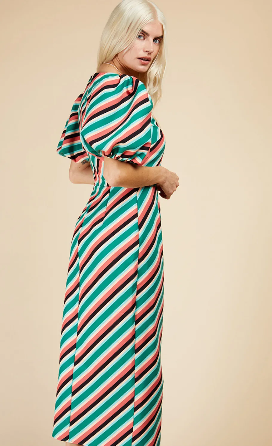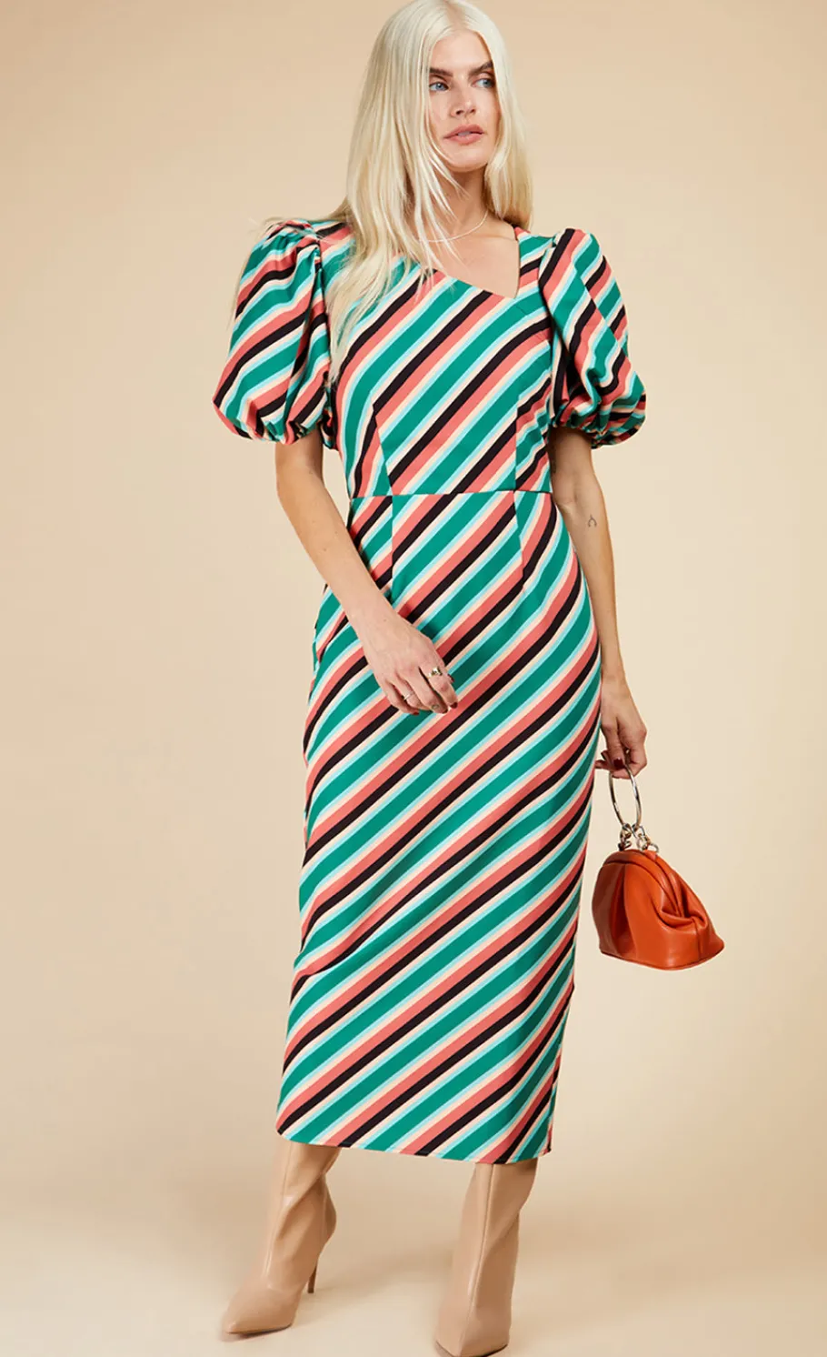 A sexy pencil fit paired with playful candy stripes – this midi comes with feel-good vibes guaranteed. We’ve added an asymmetric neckline and puff sleeves for a standout silhouette. Add strappies, a clutch and statement earrings for a master class in special occasion dressing. Print placement may vary.