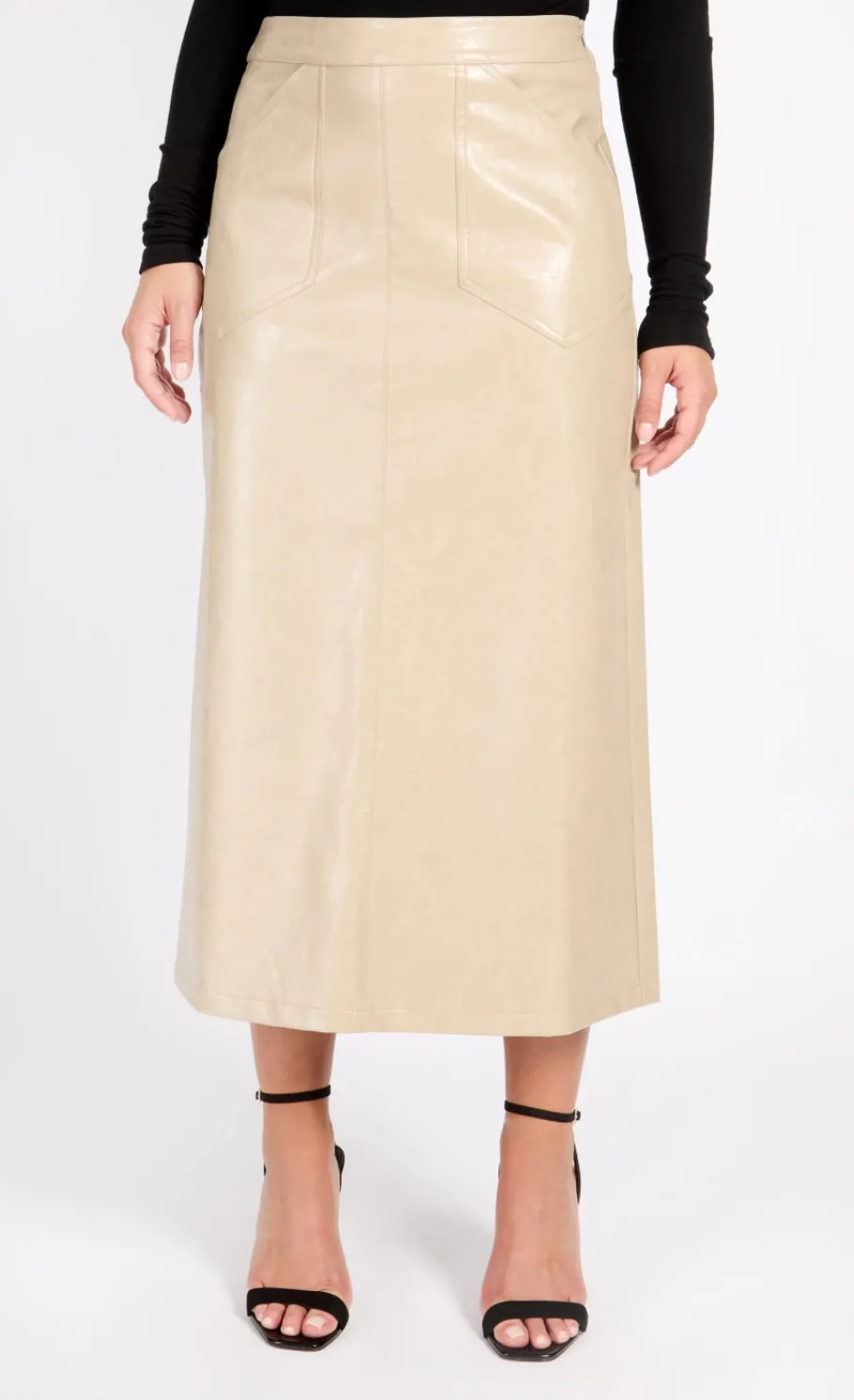 Elevate your new season wardrobe with a new season take on the PU midi skirt. Cut in a pencil silhouette and crafted in a luxe oatmeal PU. Style with a roll-neck knit and over-the-knee boots for the ultimate in day-to-day chic.