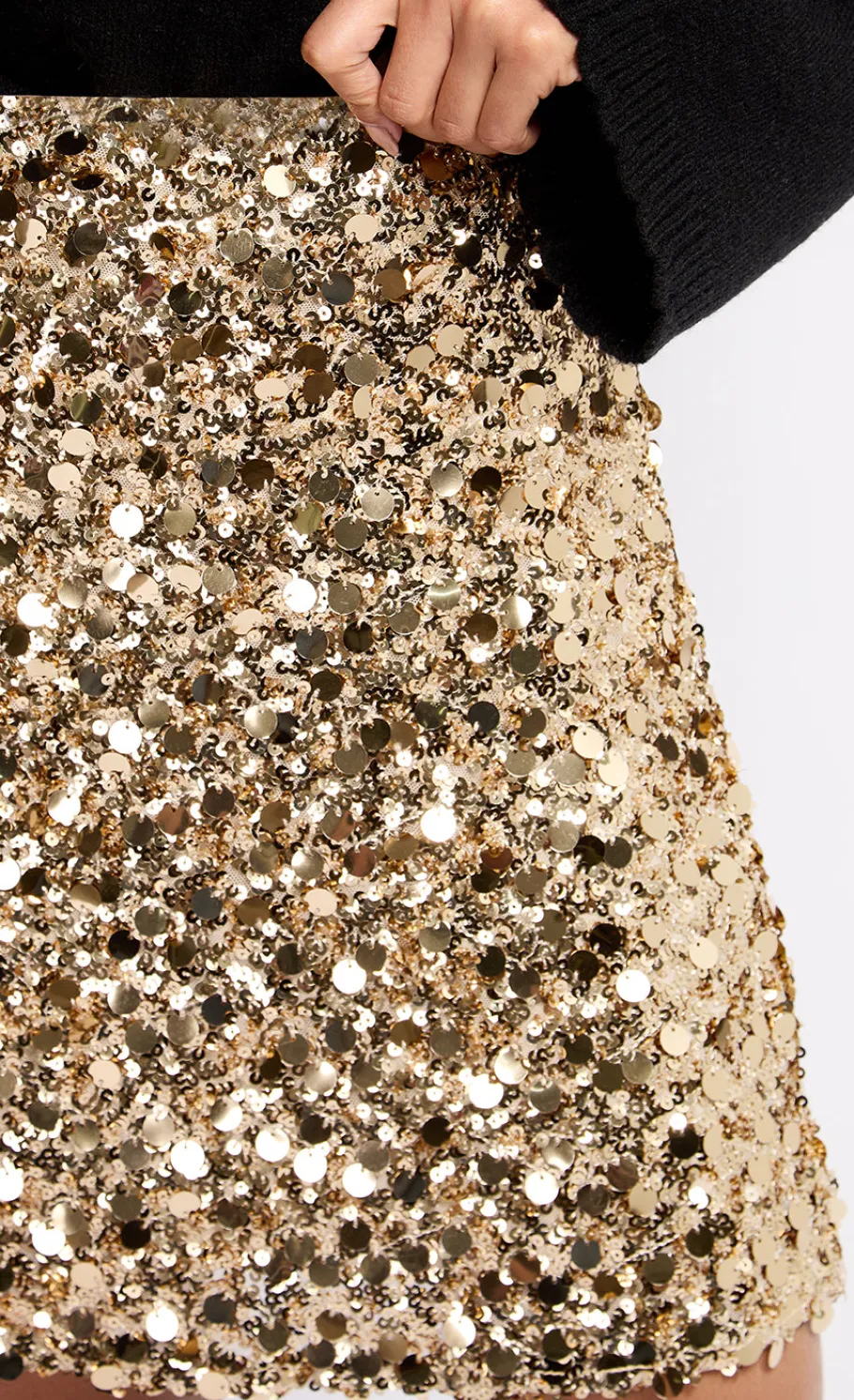 Crafted with shimmering sequins, this skirt catches the light with every move, ensuring you sparkle at any occasion. The glamorous gold hue adds a touch of luxury, perfect for festive gatherings or nights out. Its figure-flattering fit and mini length make it versatile for pairing with blouses or sweaters. Whether you dress it up with heels or opt for a more casual look with boots, this skirt promises to elevate your style.