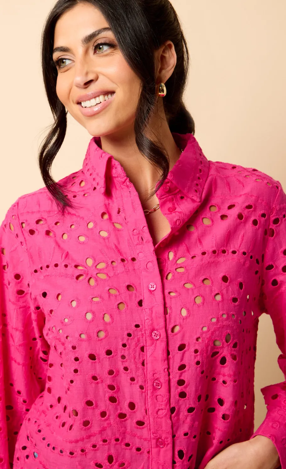 Elevate your wardrobe with the Pink Broderie Shirt, featuring a timeless turn-down collar and delicate broderie detailing. Its long sleeves and regular fit make it a versatile piece, perfect for layering or wearing on its own for a sophisticated, yet casual look.