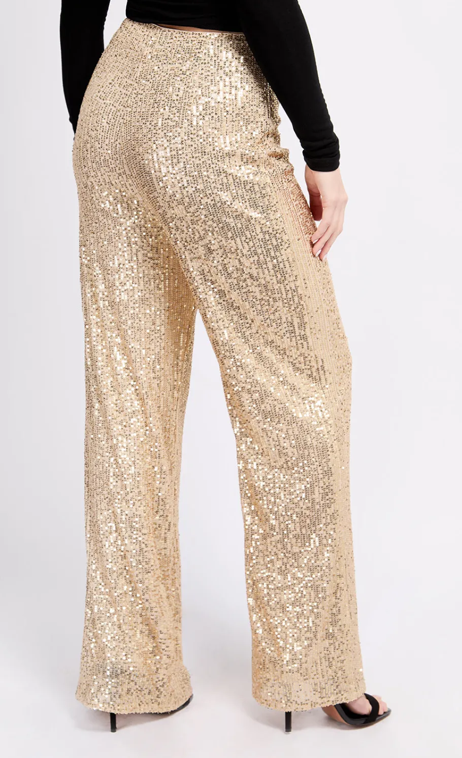 Introducing our Gold Sequin Wide Leg Trousers, a dazzling addition to your wardrobe. Crafted with shimmering sequins, these trousers radiate elegance and glamour with every step. The luxurious gold hue catches the light beautifully, perfect for festive gatherings or special occasions. The wide leg silhouette offers comfort and sophistication, while the high-waisted design flatters the figure. Pair with a simple blouse or a sleek top to let these statement trousers shine.